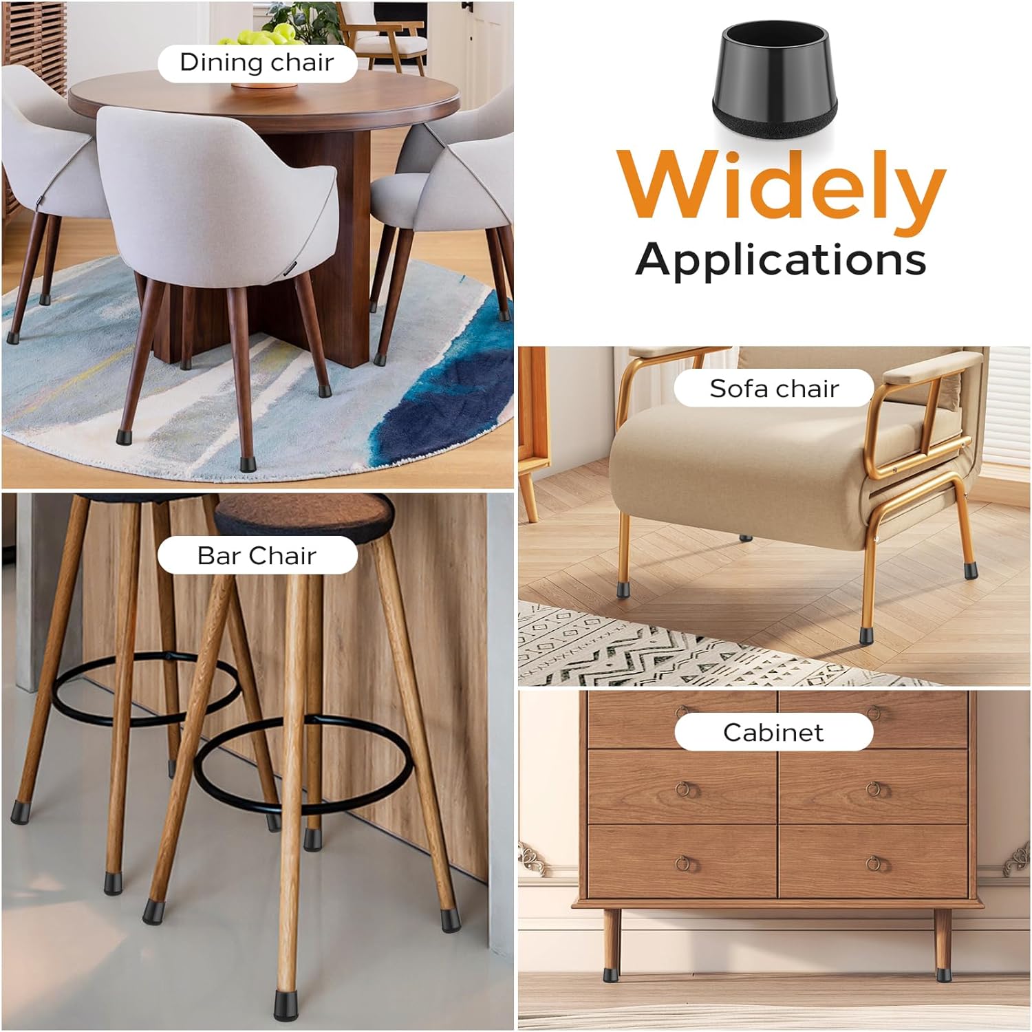 - Wide Range of Use-Rubber chair leg floor protectors are perfect for protecting hardwood floors, tile, marble, carpet, and rugs from scratches. Can be suitable for most shapes of round, square chair legs, such as kitchen chairs, dining room chairs, bar stools, metal chair legs, high chairs, bed floor protectors, sofa stool leg caps, and table leg floor protectors.