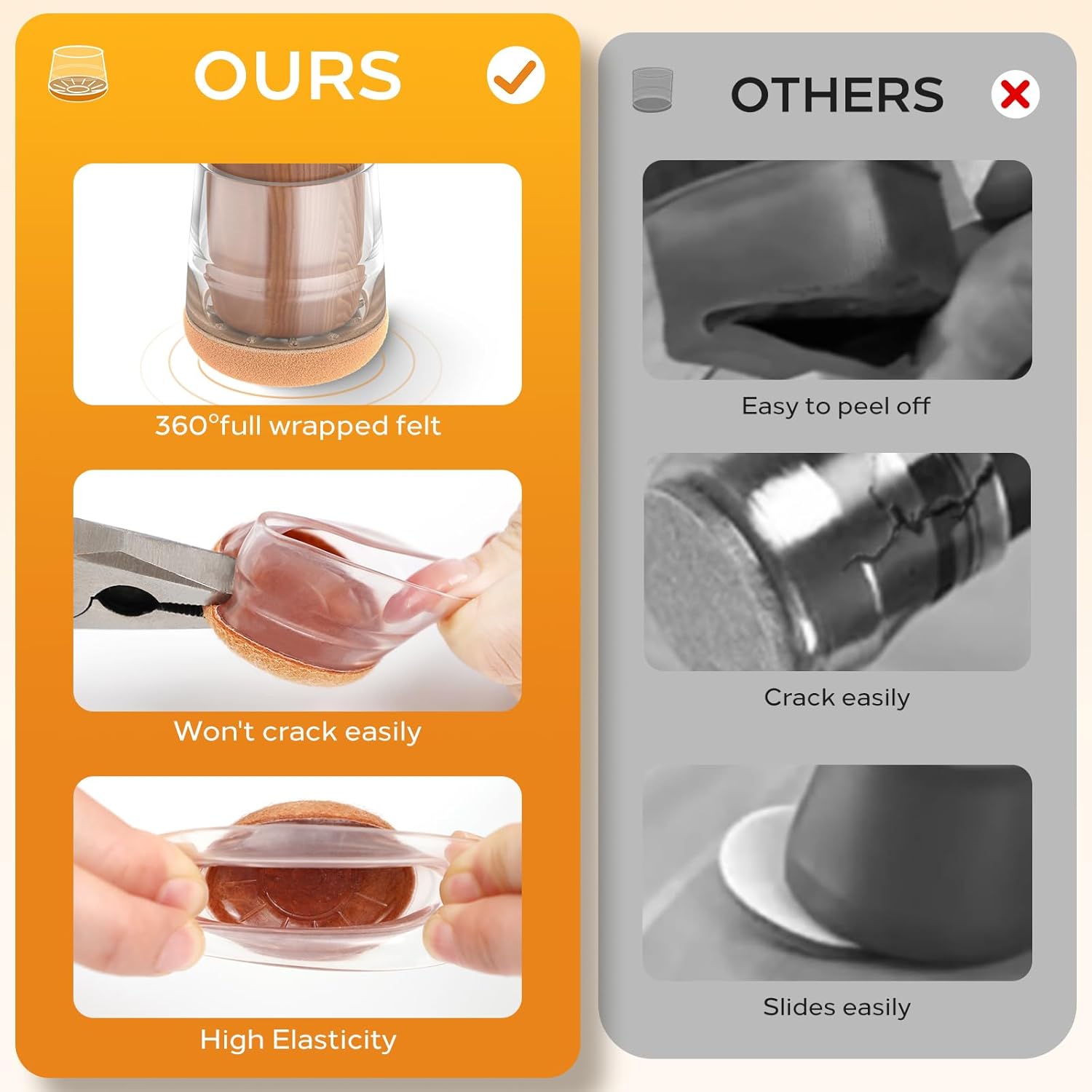- Enhanced Felt & Wear Resistance- With a 360° fully enveloping felt bottom design and heightened felt thickness, engineered to accommodate various angles of slanted chair legs. Our chair leg floor protectors have a stretch, and elasticity which can maintain longer usage time.