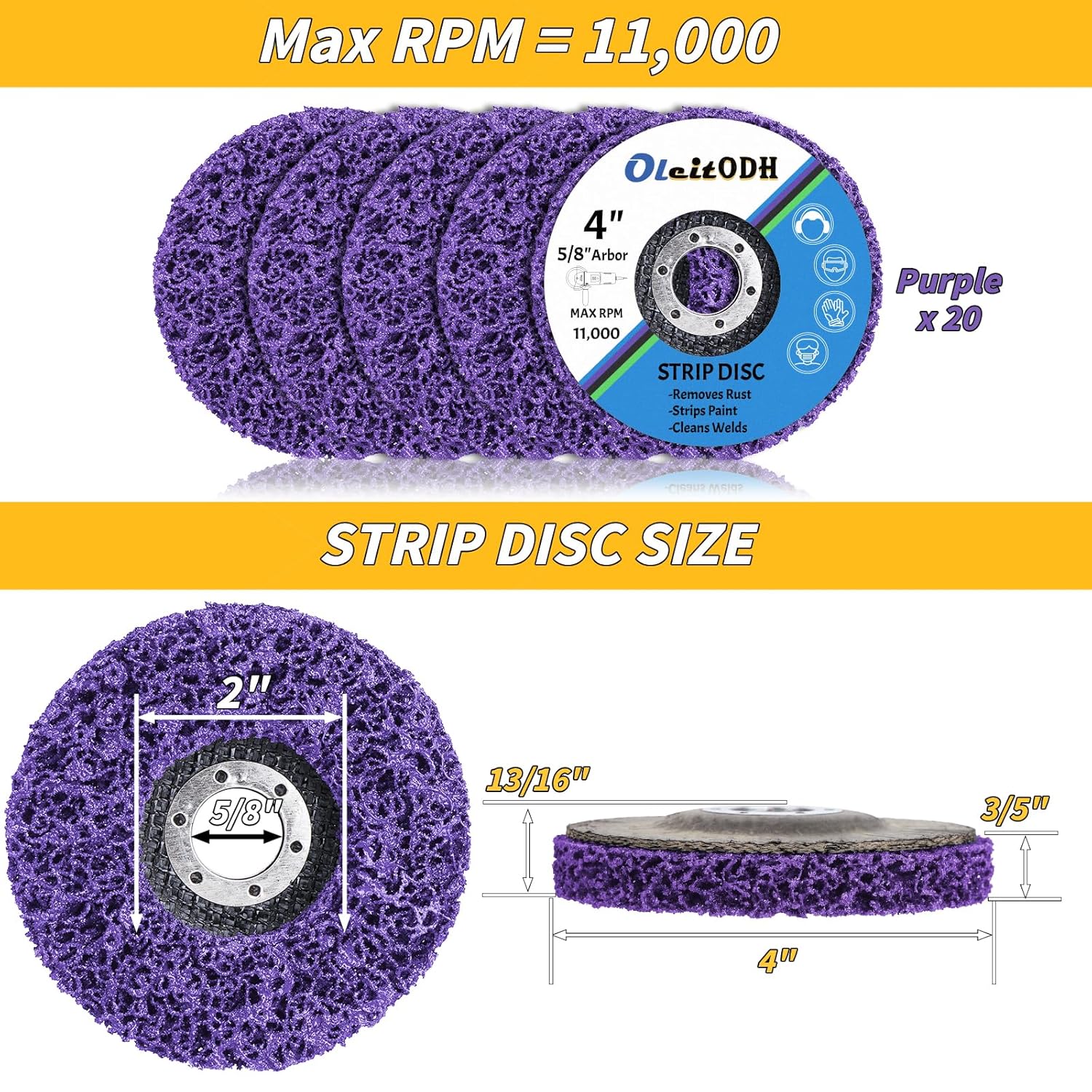 - 4" x 5/8" Strip Discs Bulk: The package includes 20x purple Paint Stripping Discand. our 4" x 5/8" strip discs effortlessly remove paint, rust, and oxidation, ensuring a smooth finish without damaging surfaces. Please be sure to wear a mask when using the strip disc to prevent inhalation of dust. We recommend that you wear gloves when using it