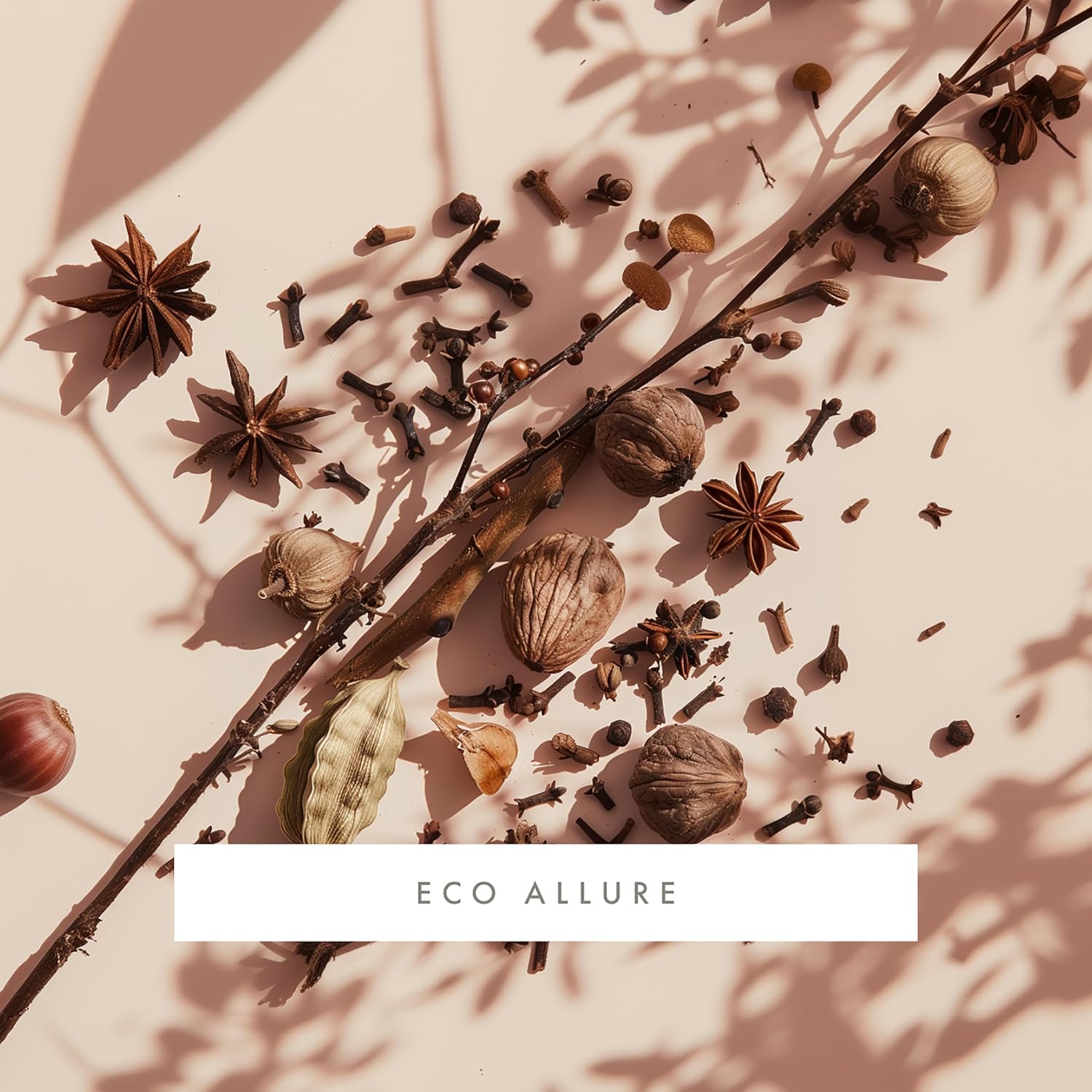 - ECO ALLURE: An alluring blend of zesty Italian bergamot, the warm spices of Guatemalan cardamom, Indonesian clove and upcycled Caribbean pimento leaf perfectly blend with soft upcycled sandalwood and upcycled French oak.