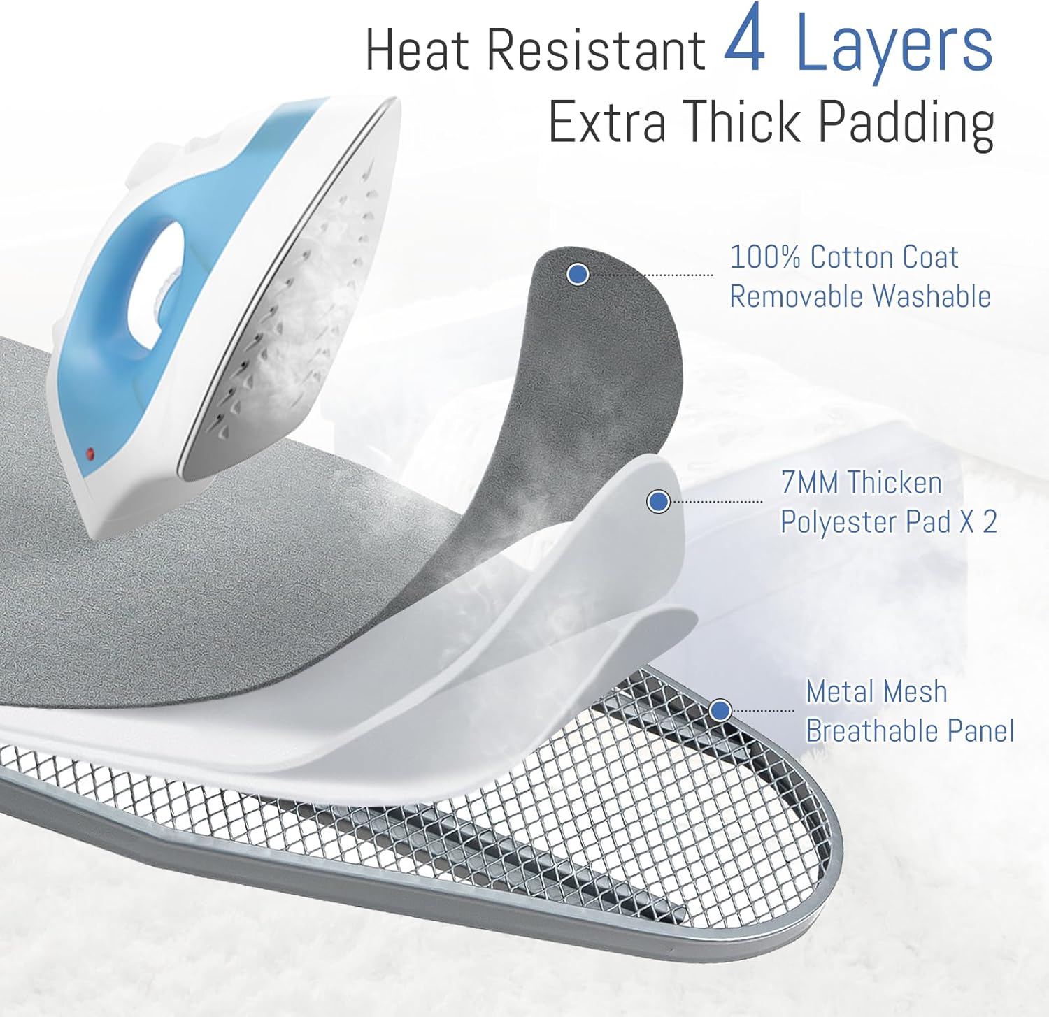 - Iron Board Cover with Padding: The silver ironing board cover is made of 100% cotton; It's removable, washable, and reusable, and it comes with 2 layers of 7 mm thick pads made of fireproof fabric; The extra thick cloth cover ensures you an extraordinary ironing experience