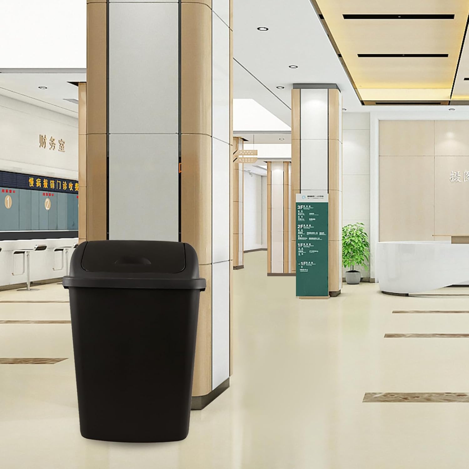 - Large plastic swing top trash can, with 18 gallon capacity, ideal for indoor or outdoor use
