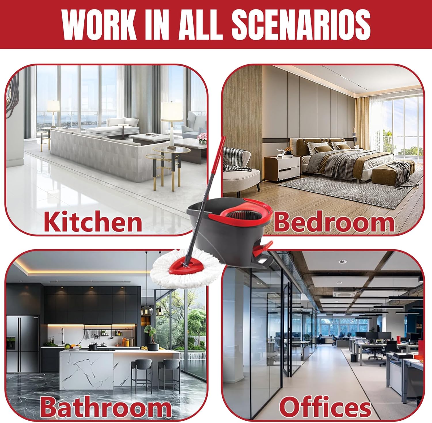 - Rinse Clean 1-Tank Bucket System: Each spin mop head is packaged independently for easy storage and space saving, Not available for 2 cylinder rotary mop system