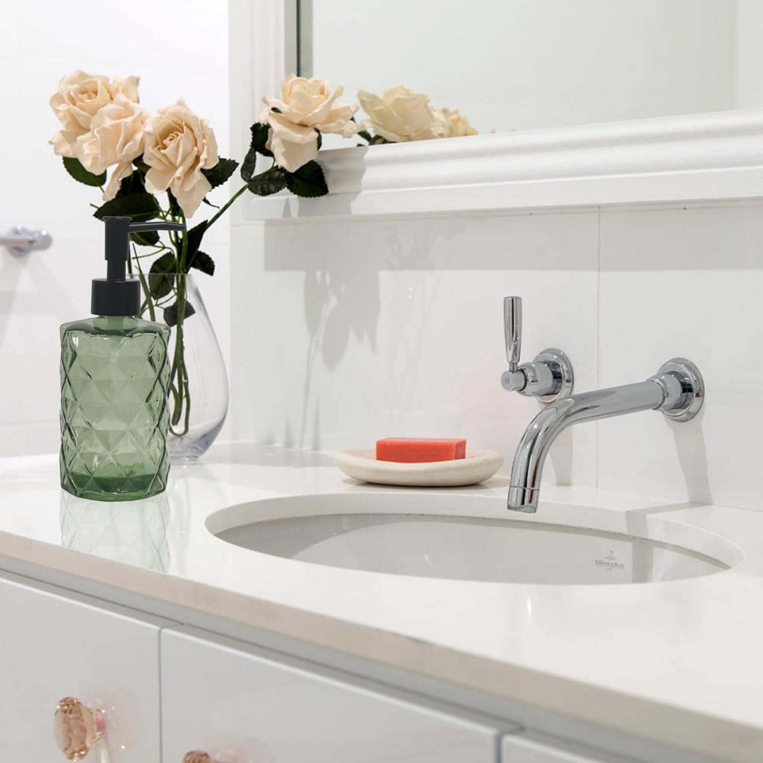 Green Glass Soap Dispenser, 12oz Bathroom Hand Dispenser, Lotion Dispenser with Black Plastic Pump for Modern Home Decor, Kitchen Countertop, Hotel