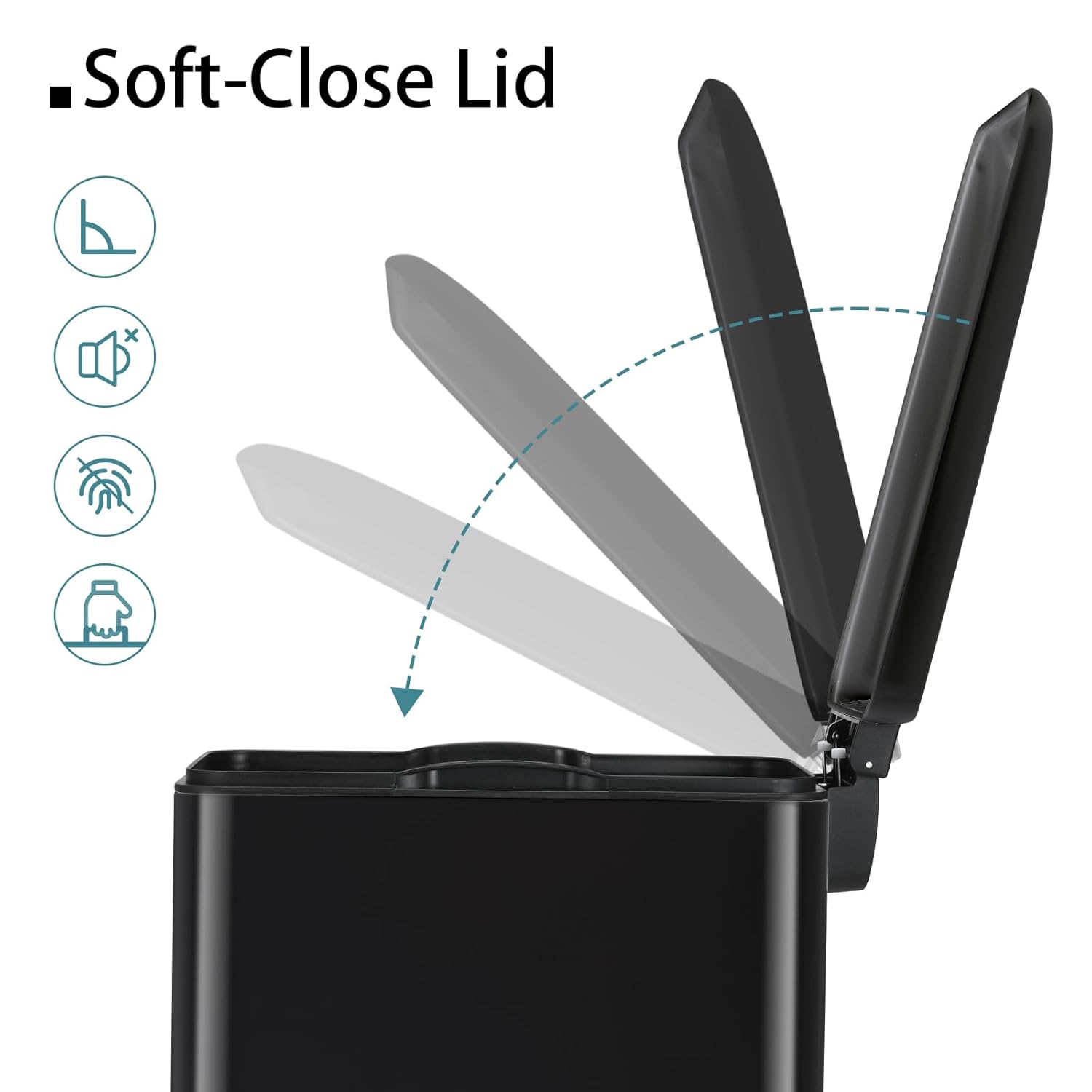 - 【Quiet-Close Lid】Garbage can lid is specially designed for a quiet, controlled open and close every time, so you can use the kitchen garbage can with confidence without worrying about disturbing your family. And it would also be a good choice to put the garbage cans in the corner of the bedroom.