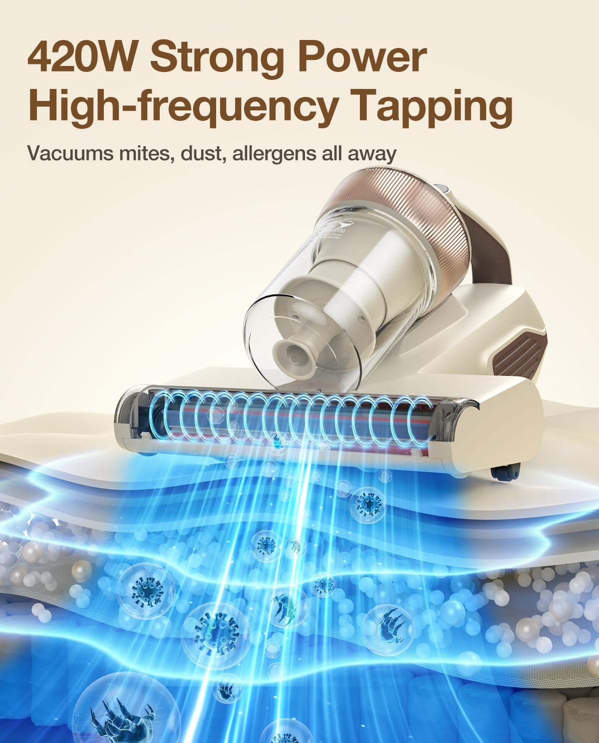 • 99.99% dust removal: Our advanced 3-in-1technology combines UV sanitizing, ultrasonic waves, and high heating, ensuring that our mattress vacuum eliminates 99% of dust. Protect your family from skin troubles and enjoy a comfortable night's sleep.