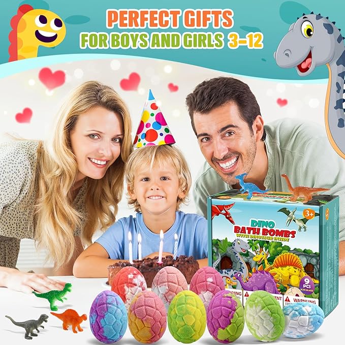 - Inside Surprise Toy: Each bath bomb contains a hidden toy surprise, adding an element of excitement and anticipation to every bath. Watch your child’s eyes fill with joy! Our dinosaur toys are made of safe materials and passed the U.S. Children's Products Toy Safety Test. These dinosaur toys do not pose a choking hazard and can also be used for collection, allowing children to learn about ancient creatures and cultivate their imagination. So, this bath bomb gift set will give boys and girls the best surprise at bath time