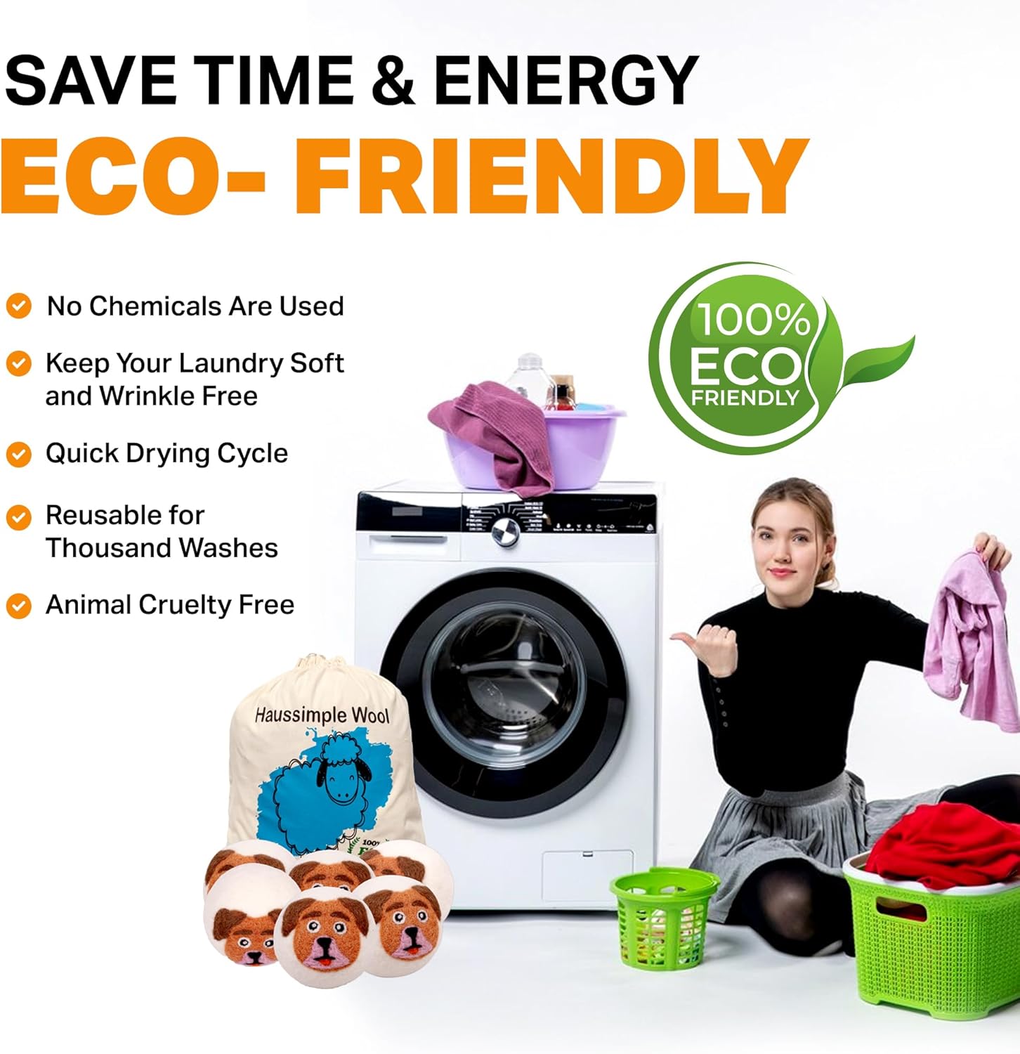 Wool Dryer Balls Organic Felt 6 Pack Laundry Fabric Softener, Extra Large Reusable Handmade Natural Sheep Wool Lint Wrinkle Free Anti Static Baby Safe (Orange Dog)