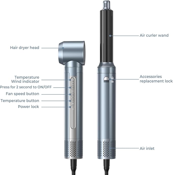 - 6 in 1 High Speed Blow Dryer Brush:Long press 2s Power button to turn on/off the hair dryer. 6 in 1 hair styler kit includes 1*high-speed ionic hair dryer, fast drying hair, 2*hair curlers to curl in different directions, curl set automatically Technology, 1*round brush smooths,and adds bounce, 1*Volumizer, reduces static and tangles, increases fluffiness,1*Massage hair straightener brush for straightening & smoothing. Explore styles for any hair type,saving your time and money.