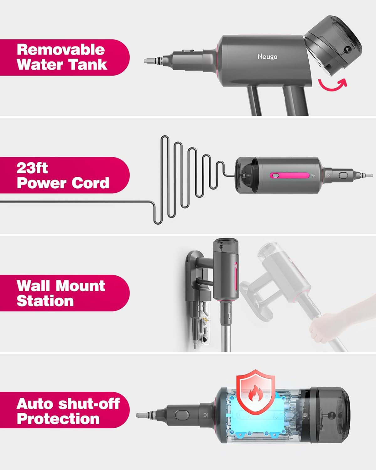 - 1500W 230 °F Steam, Deep Cleaning: Neugo powerful 1500 W steam mop produces continuous abundant steam and reaches temperatures of 230 °F to penetrate deep into surfaces, making it the perfect solution for deep cleaning and removing tough grime and grease with just water. Keep your floors sparkling clean. (ADD WATER ONLY, remove the carpet glider before mopping hard floor)