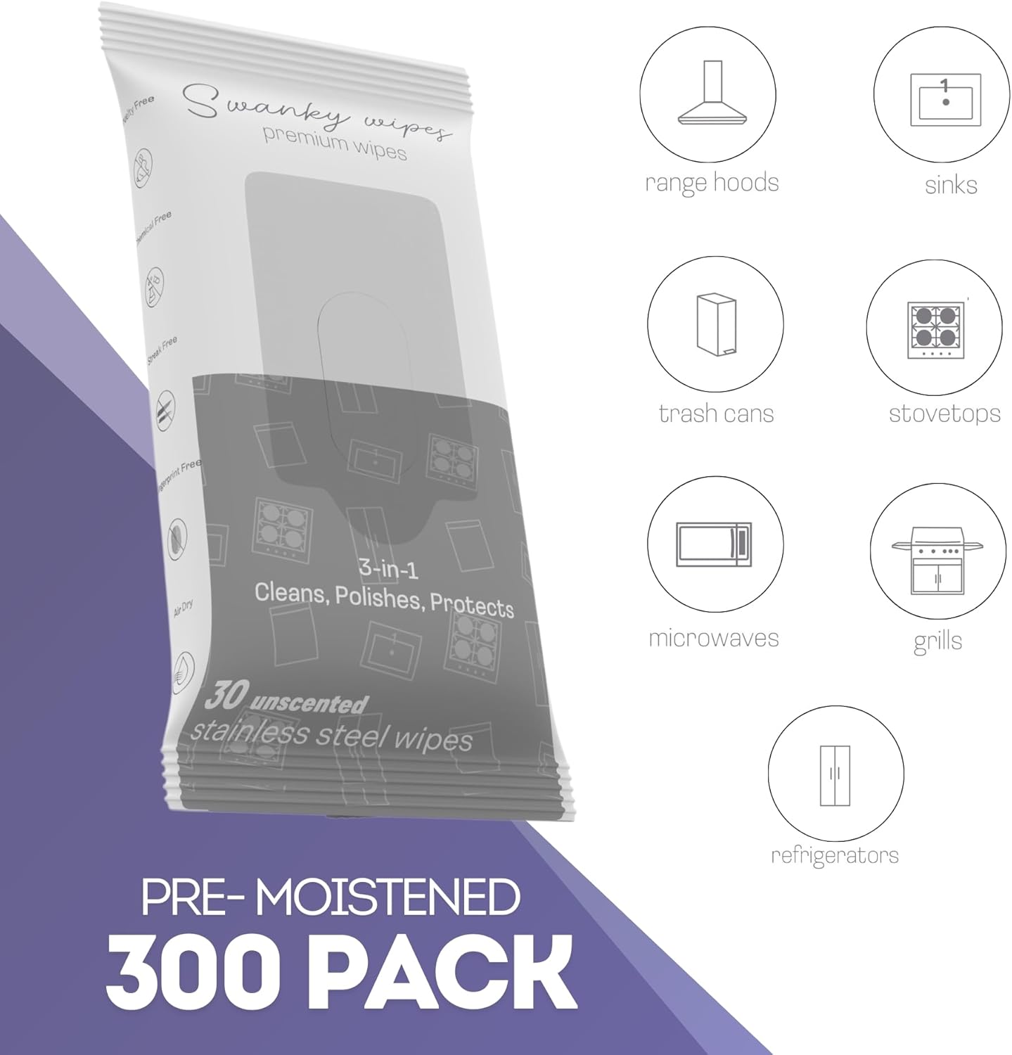 - PRODUCT SPECS - Swanky Stainless Steel Cleaning Wipes come in a pack of 300 soft, non-scratch wipes. Each wipe is pre-moistened and ready to use, making them a convenient addition to your cleaning supplies. Ideal for keeping your stainless steel appliances looking polished and clean.