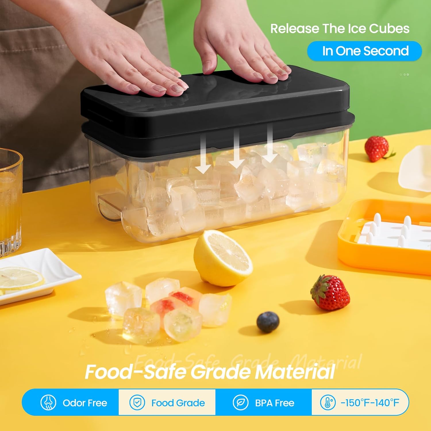 - Newly upgraded press-type ice cube trays, Releases all ice cubes in one second: This ice cube Molds is made of high quality food grade hard plastic and is BPA free. After placing one ice tray upside down on the ice storage bin, close the lid and press the middle of the lid with both hands, all ice cubes can be easily released in one second