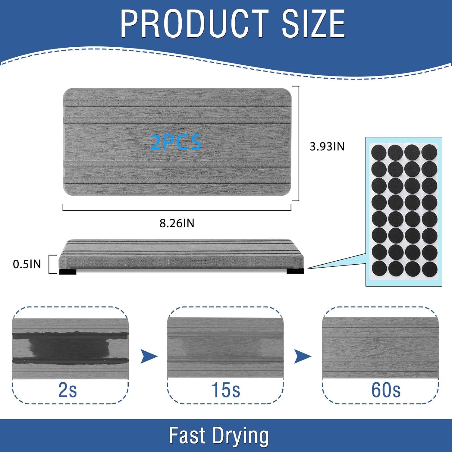 - Perfect Size & 2-pieces --- Our fast drying stone sink tray are thicker and larger than other products. Packaging Includes: 2 pieces pads of 8.27 inches * 3.94 inches * 0.5 inches (21 cm * 10 cm * 1.25 cm); Silicone non-slip pad * 32; 2 pieces of sandpaper. They can meet your daily needs.