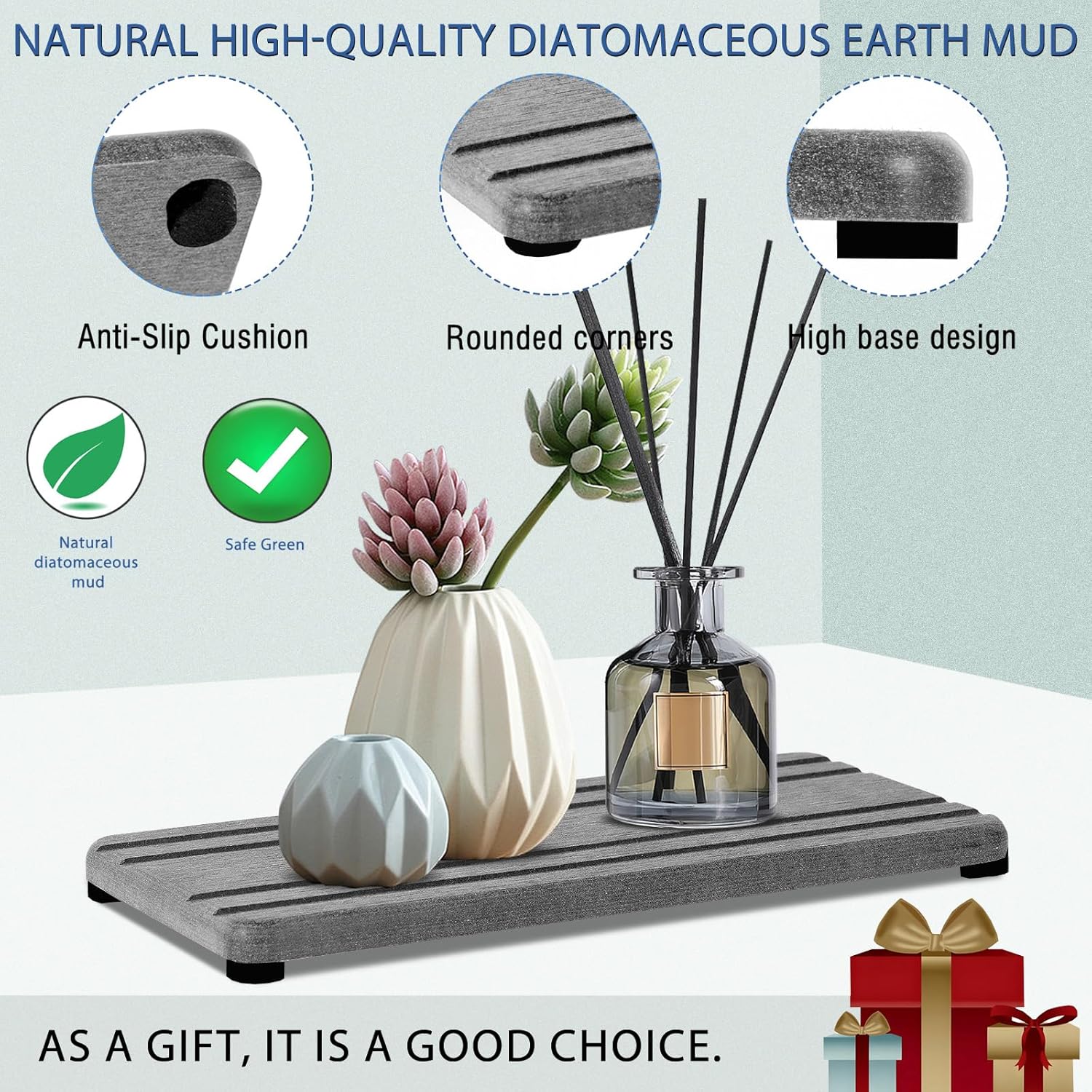 - More Anti Slip and Ventilated --- The silicone footpads boost the slip-resistance of water absorbing stone while keeping them out of the bathroom vanity.This design improves the contact surface between water absorbent diatomite tray and air,accelerates the evaporation of water,and extends the service life of the water absorbing stone tray for sink.