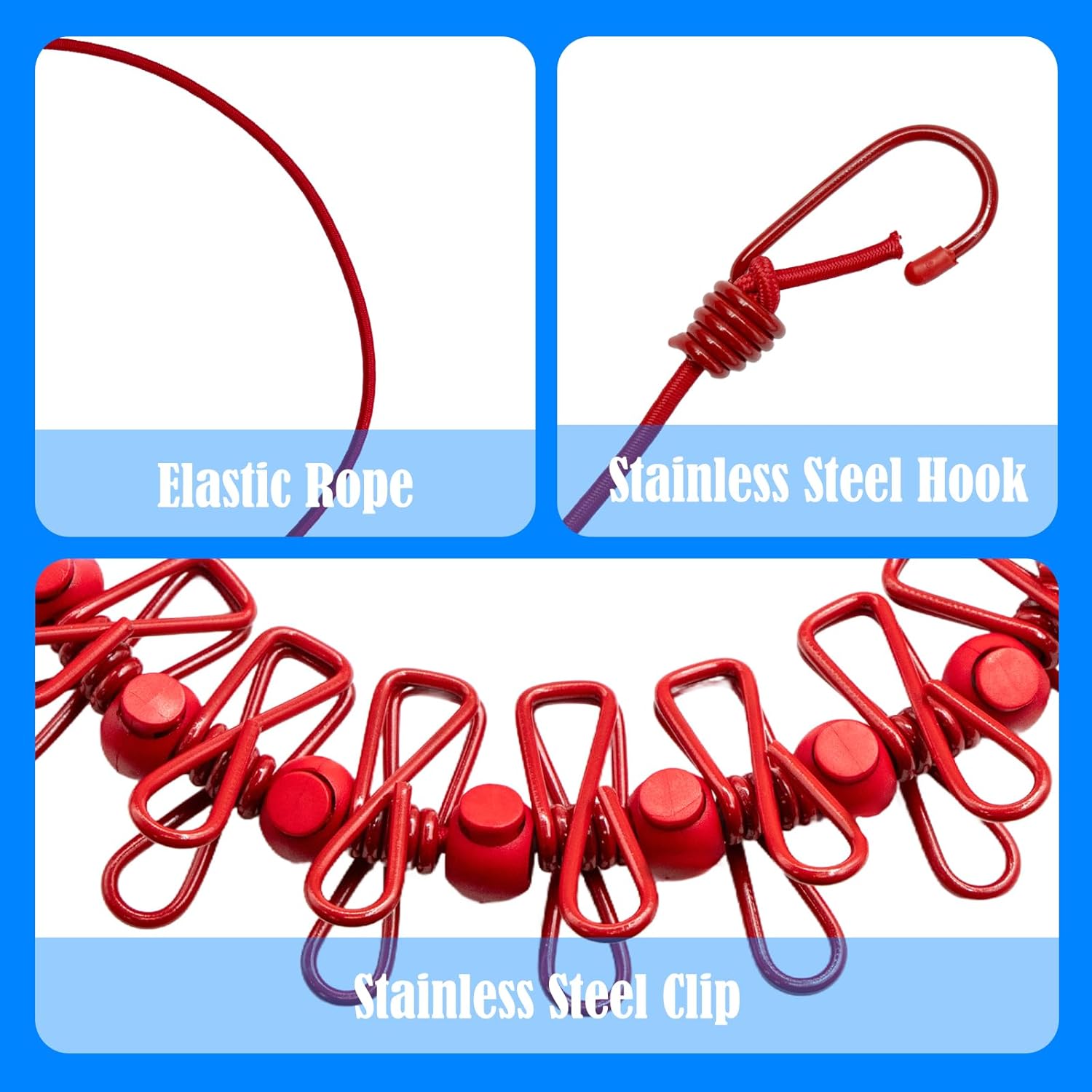 - [Innovative Design] The travel clothesline features 12 clothesline clamps and 13 windproof, non-slip clamps, all designed with a positioning bead. Our sturdy elastic rope supports heavy clothing more effectively than other clotheslines.