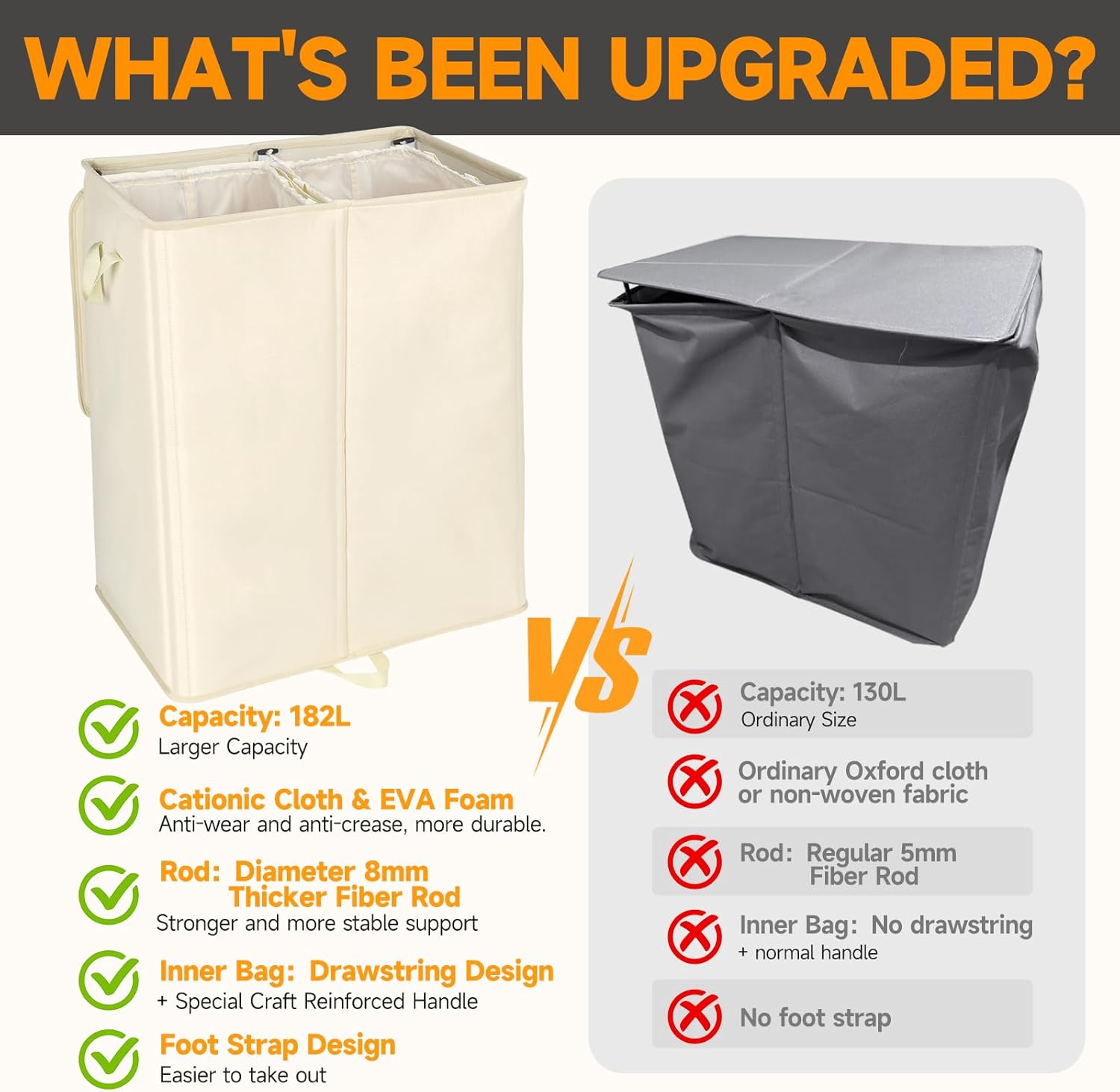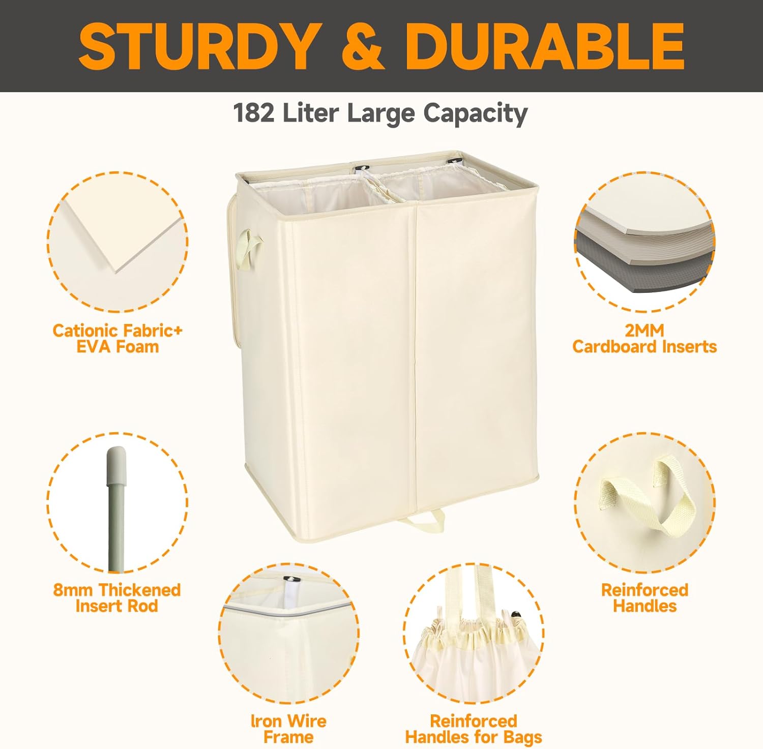 - ăDurable FabricăThe dual laundry bin is made of 300D cationic cloth and 1.2mm thickened EVA composite material.Cationic cloth added polymer materials, effectively enhance the overall strength of the fabric, compared to ordinary Oxford cloth not only greatly improve the service life, but also has a waterproof, abrasion-resistant, tear-resistant, moisture-absorbent, breathable and other characteristics. At the same time the composite layer of EVA foam more enhanced these advantages