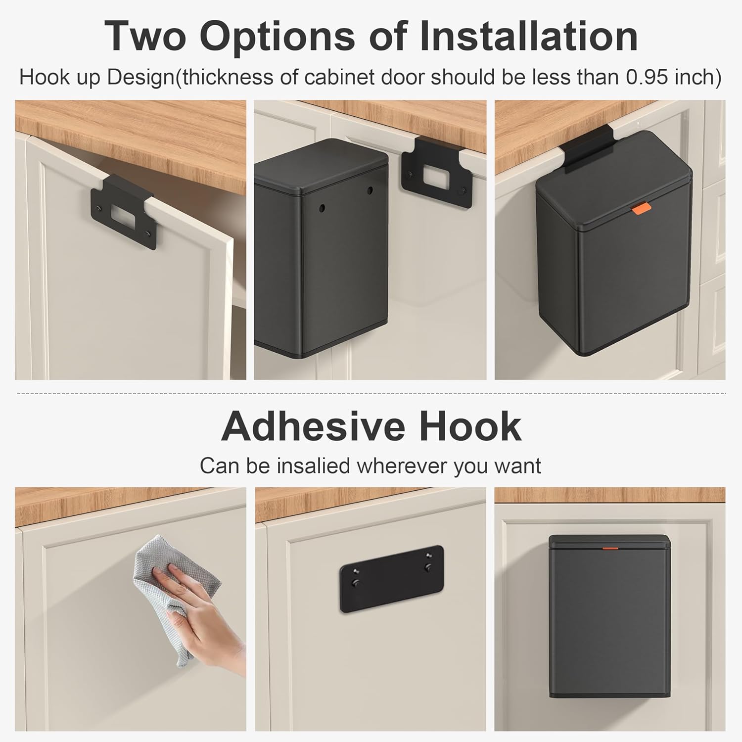 • 【WALL MOUNTED/COUNTERTOP/ UNDER SINK TRASH CAN】No need to bend over. The trash can provide Two opening and installation methods,Effortless and Fits for Most Cabinet Doors, Pantry Doors. The thickness of door should be less than 0.98" (2.5 cm). Small trash can can also be glued on kitchen or bathroom wall or under the sink