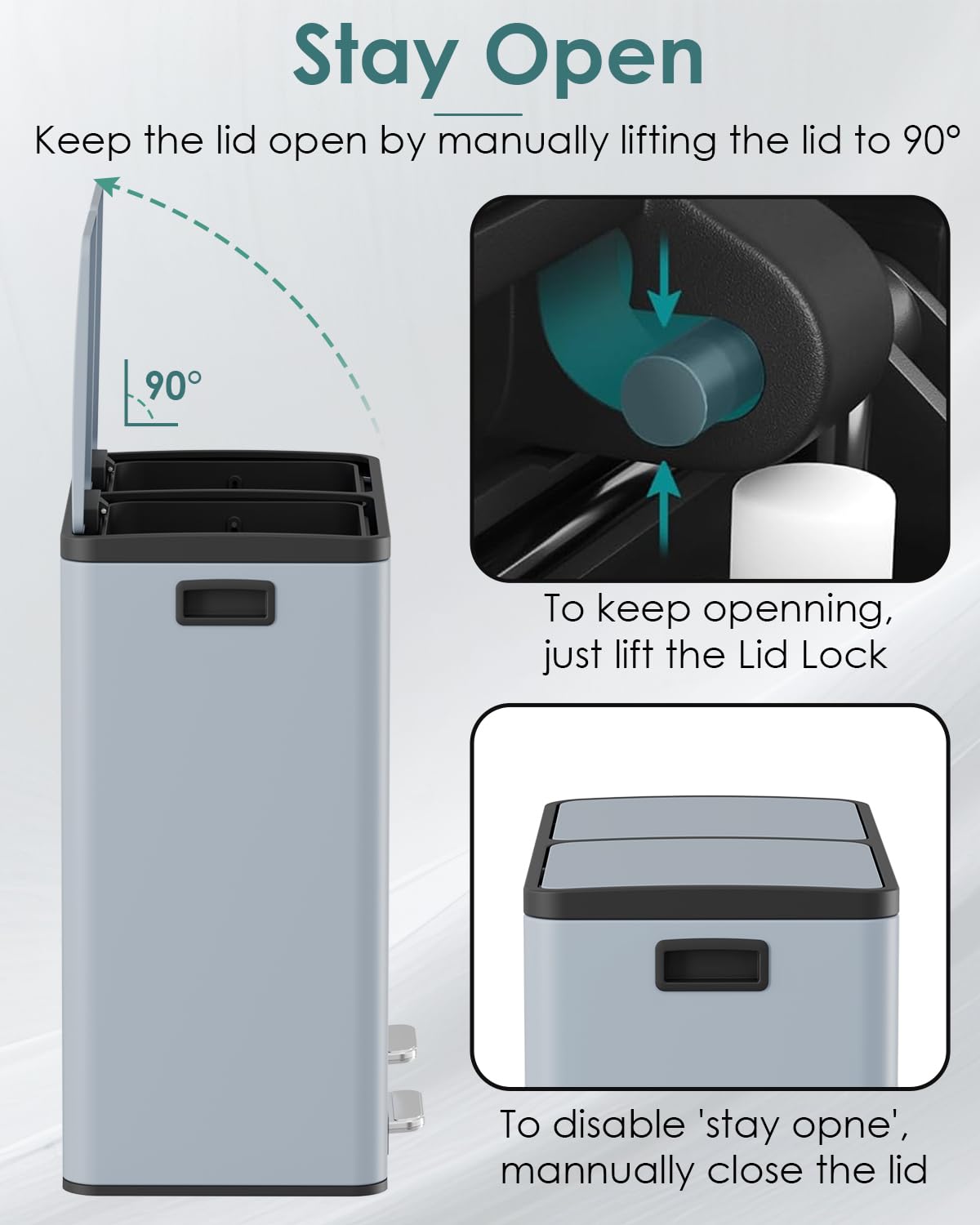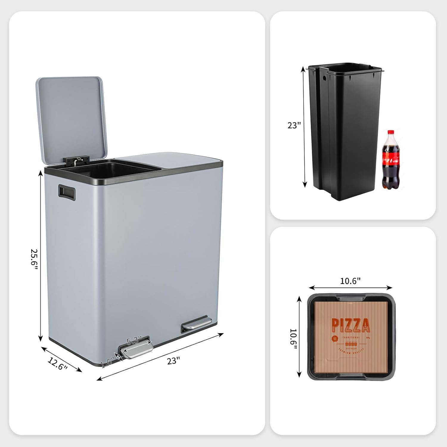 - 2*8 GALLONS COMPARTMENTS: Trash can has two independently compartments for trash and recyclables, making it easy to sort waste.
