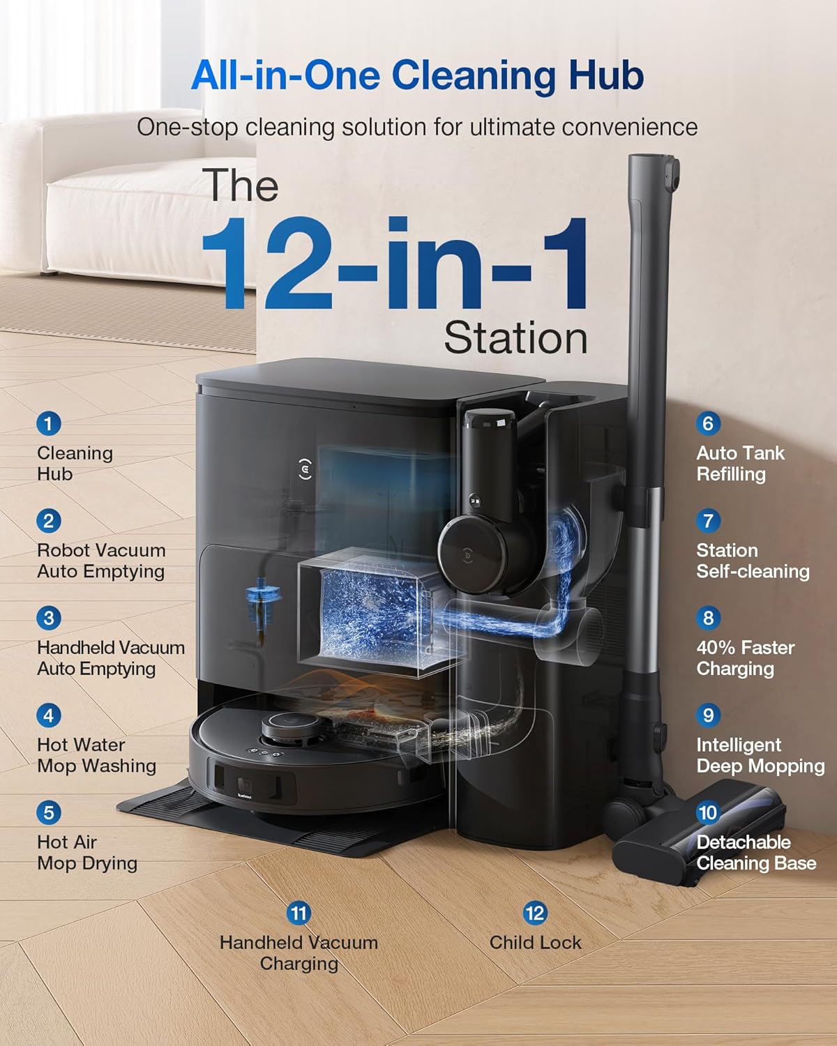 • [All-in-One Cleaning Hub] This space-saving design features a bidirectional dust collection system, allowing both vacuums to auto-empty their dustbins into the station's large capacity bag. Plus, it also supports 158℉ hot-water mop washing, hot-air drying and auto water refilling. Ready to tackle any cleaning task, save you time and effort.