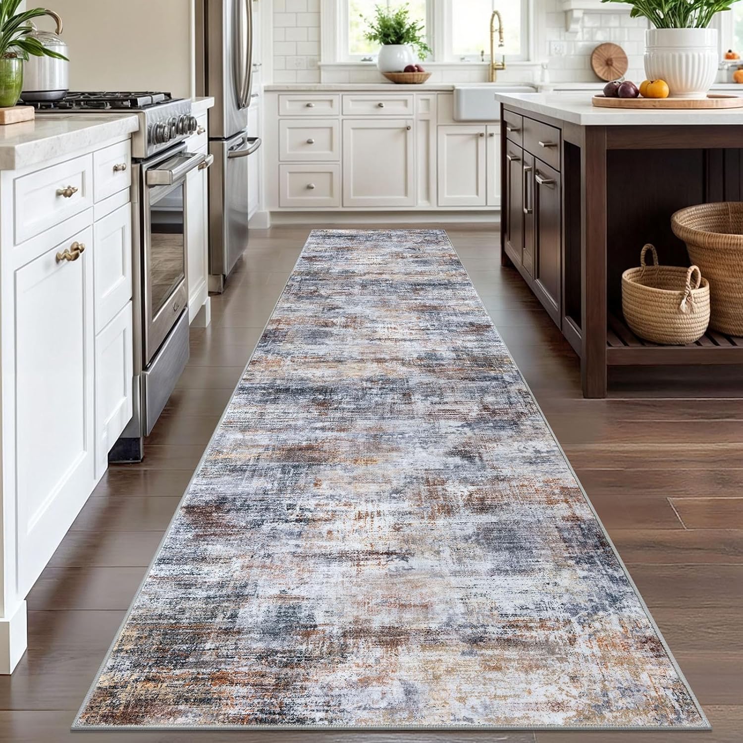 IOHOUZE Abstract Runner Rug 3x12 Ft Washable Runners for Hallways, Non Slip Kitchen Runner Printed Faux Wool Entryway Runner Indoor, Modern Abstract Floor Carpet for Hall Kitchen, Orange Grey