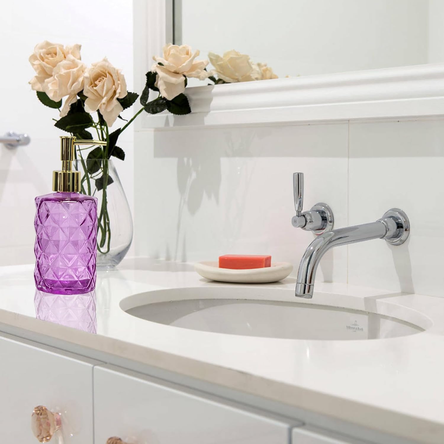 - Glass Soap Dispenser with Gold Pump: Our rose glass soap dispenser is made of high-quality lead-free glass, naturally and safely filled with various indoor liquids for daily use. Glass lotion bottle is reusable, refillable, environmentally friendly, and recyclable.