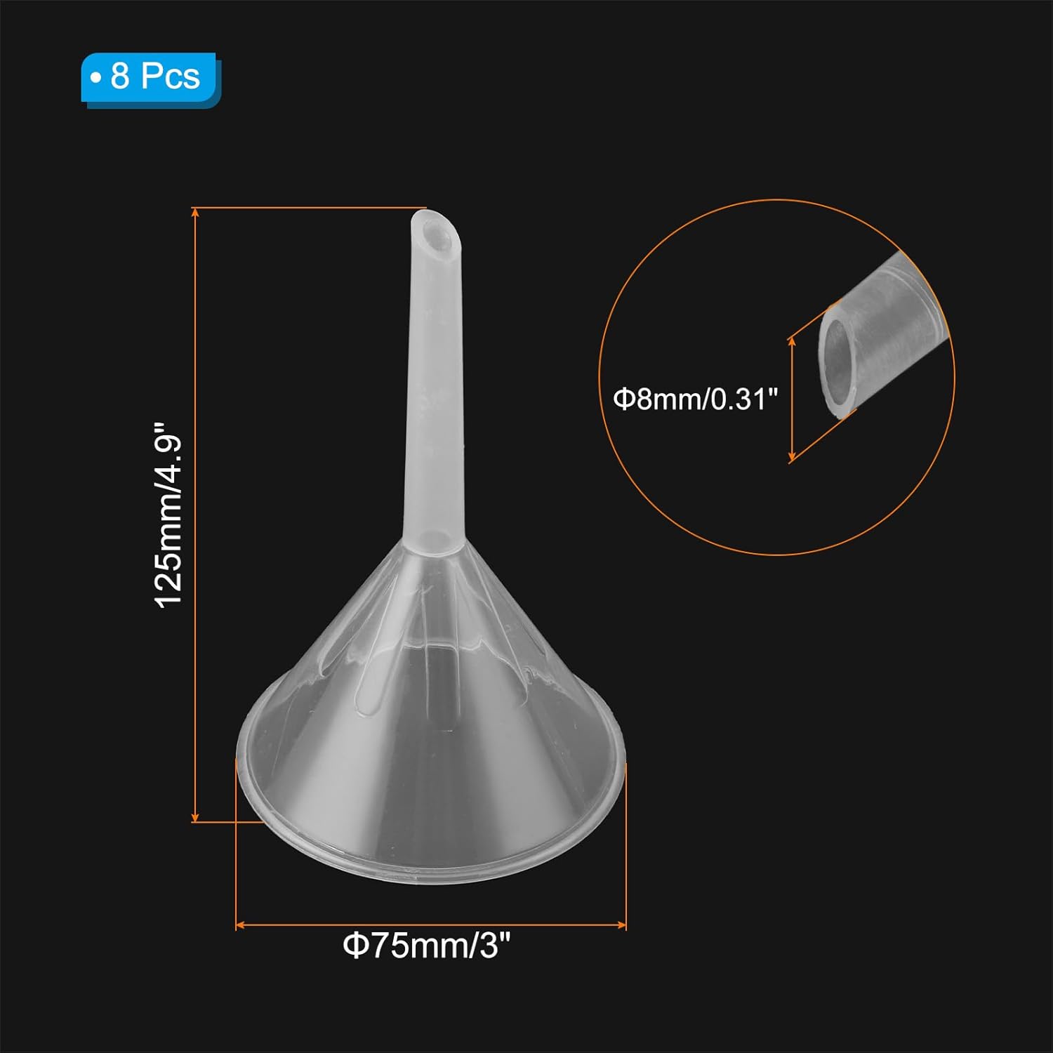 - Color: Clear; Material: PP Plastic; Top Opening Dia: 75mm / 3 inch; Outlet Dia: 8mm / 0.31 inch; Length: 125mm / 4.9 inch; Packing List: 8 x Clear Plastic Funnel