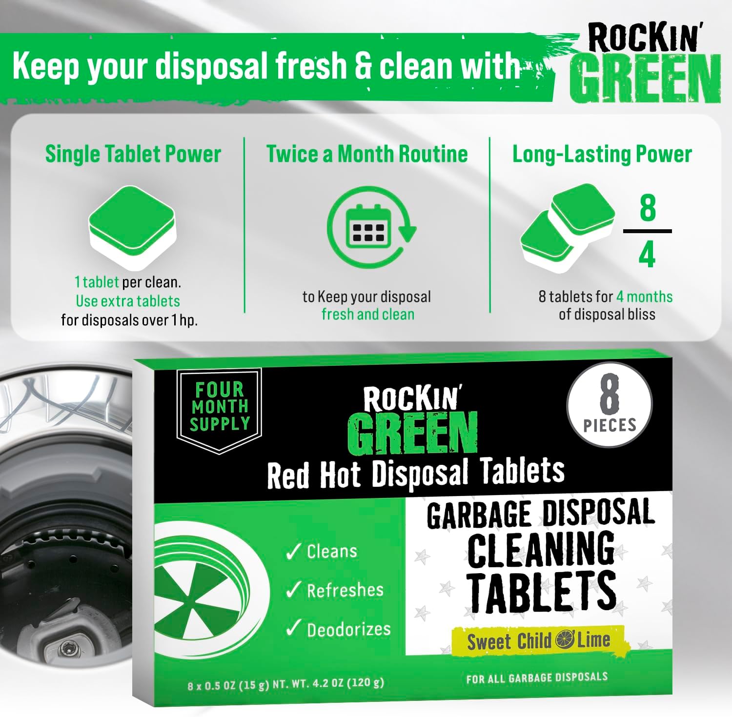 - Sweet Child O'Lime Scent – Treat your garbage disposal to a refreshing burst of light lime fragrance with every clean. Rockin' Green sink disposal cleaner tablets neutralize odors and leave a subtle, fresh aroma, keeping your disposal smelling clean and renewed every time you use it.
