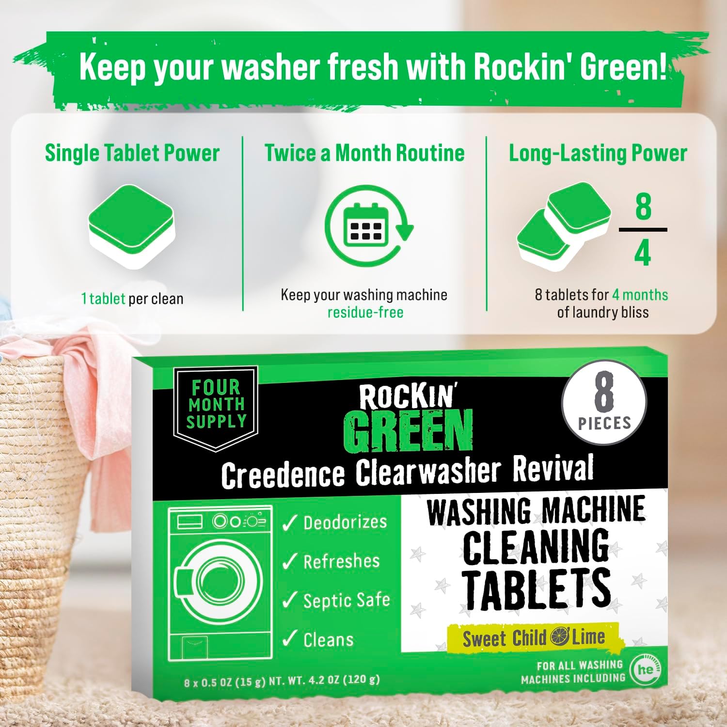 Rockin' Green Deep Cleaning and Deodorizing Tablets for Dishwashers, Washing Machines, and Garbage Disposals, Removes Odor and Residue (Washing Machine Cleaning Tablets, 8 Pack)
