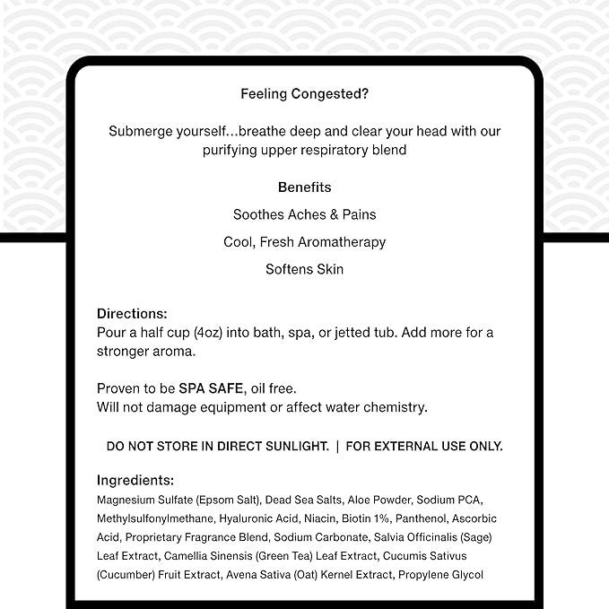 - CLEAN, SPA-COMPATIBLE MINERAL BLEND: Made with Epsom & Dead Sea salts, this soak dissolves effortlessly without disrupting spa water chemistry, filters, or surfaces—formulated specifically for whirlpools, Jacuzzis, and jet systems.