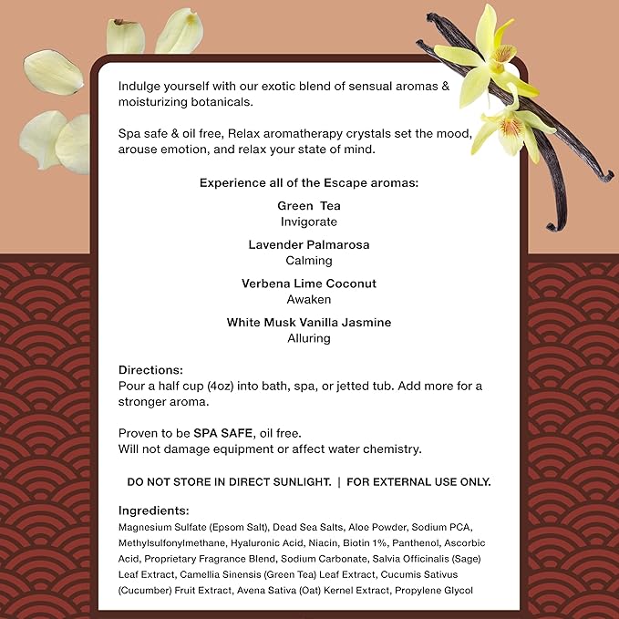 - SCENTED TO FEEL LIKE A LUXURY SPA: Let white musk, soft vanilla, and delicate jasmine surround your senses in a warm, refined aroma. This blend of aromatherapy bath salts is made for deep, luxurious soaks in hot tubs, Jacuzzis, and spas.