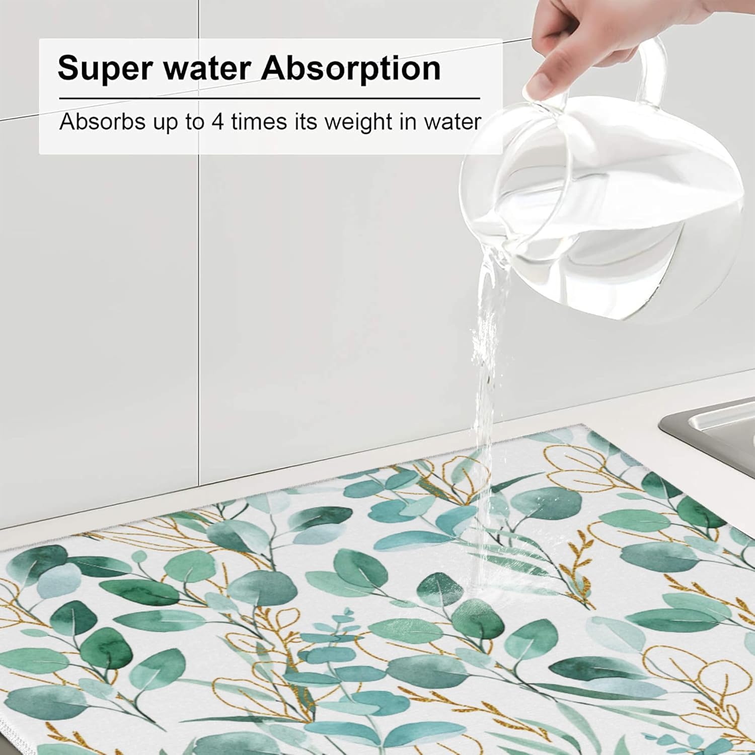 Sage Green Leaves Dish Drying Mat for Kitchen Counter Cute Botanical Dish Drainer Rack Mats 16"x18" Absorbent Reversible Drying Pad Spring Summer Kitchen Decor