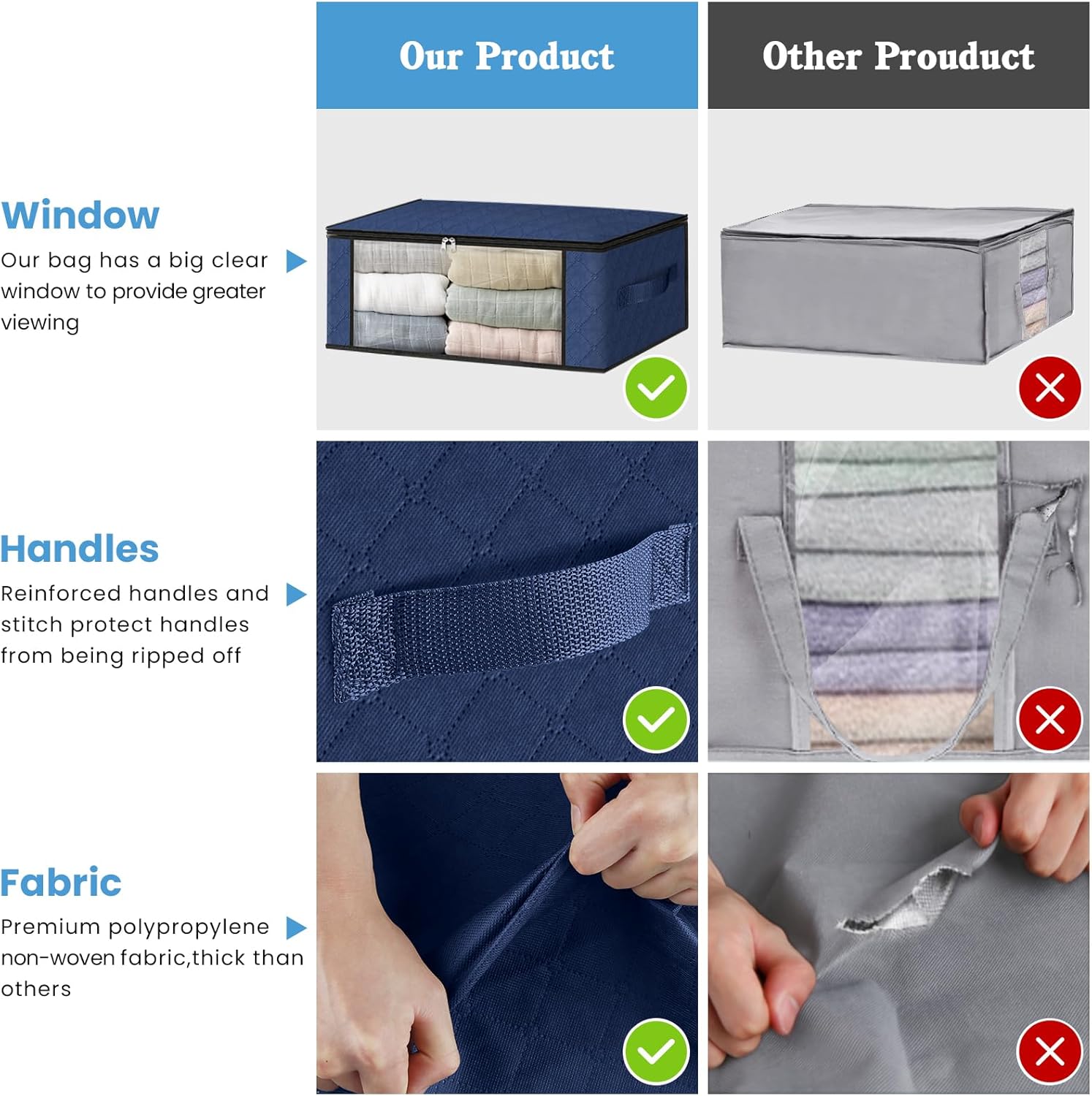 HomeHacks Storage 3-Pack Clothes Organizer Storage Bags Foldable Storage Box with Large Clear Window Sturdy Handles for Closet, Dorm, Pillows, Bedding, Clothes, Blankets, 35L, Blue