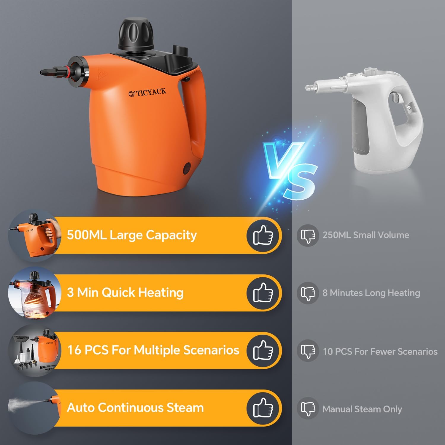 Handheld Steam Cleaner, Steam Cleaner with 16 PCS Accessory & Safety Lock, 500ML Large Capacity Natural Surface Steam for Cleaning, Multipurpose Steamer for Home, Car, Bathroom, Grease (Orange)