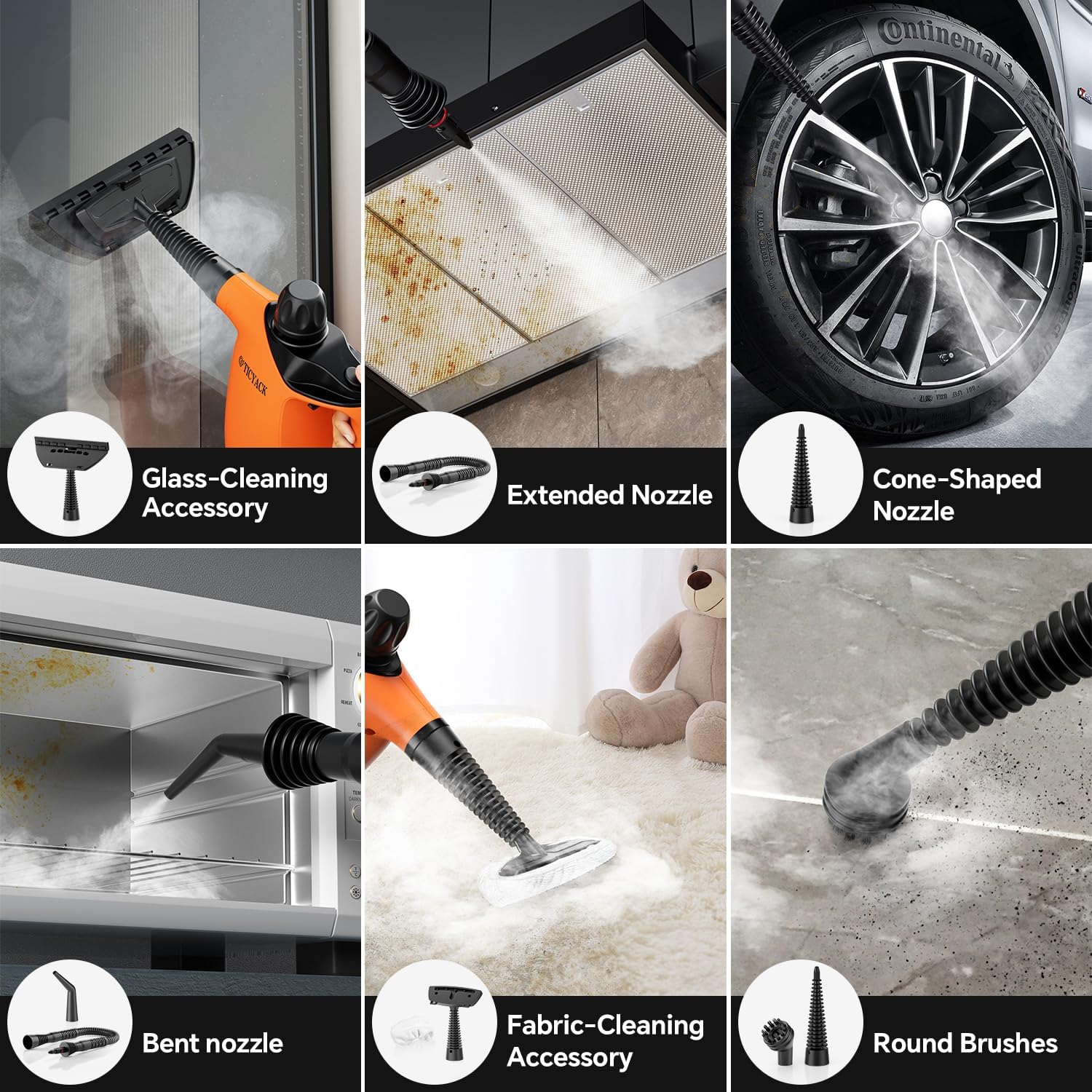 - ă16-Piece Steam Cleaner SetăOur household steam cleaners come with a comprehensive 16-piece accessory set, providing you with the flexibility to choose the right tools for cleaning hard-to-reach areas. Handheld Steam Cleaner can be used in different scenarios, for example kitchen, bedroom, living room, car leather goods, bathroom, clothing and so on. Whether it is stubborn grease or dust in the crevices, it can be swept away.