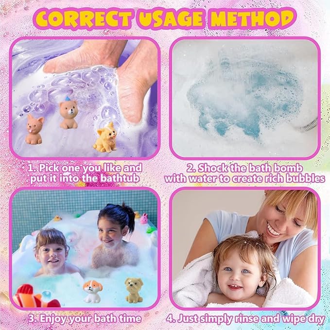 - Bath Bombs for Kids - Each kids bath bombs has different surprise inside. Including 20 pleasantly surpriseddifferent dog , 20 different scents, bring different surprises to your child's every bath. Cute dog add fun to the bath.