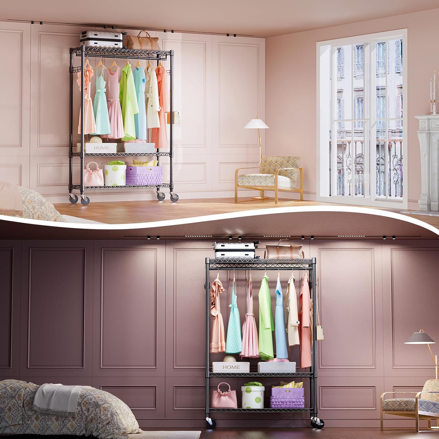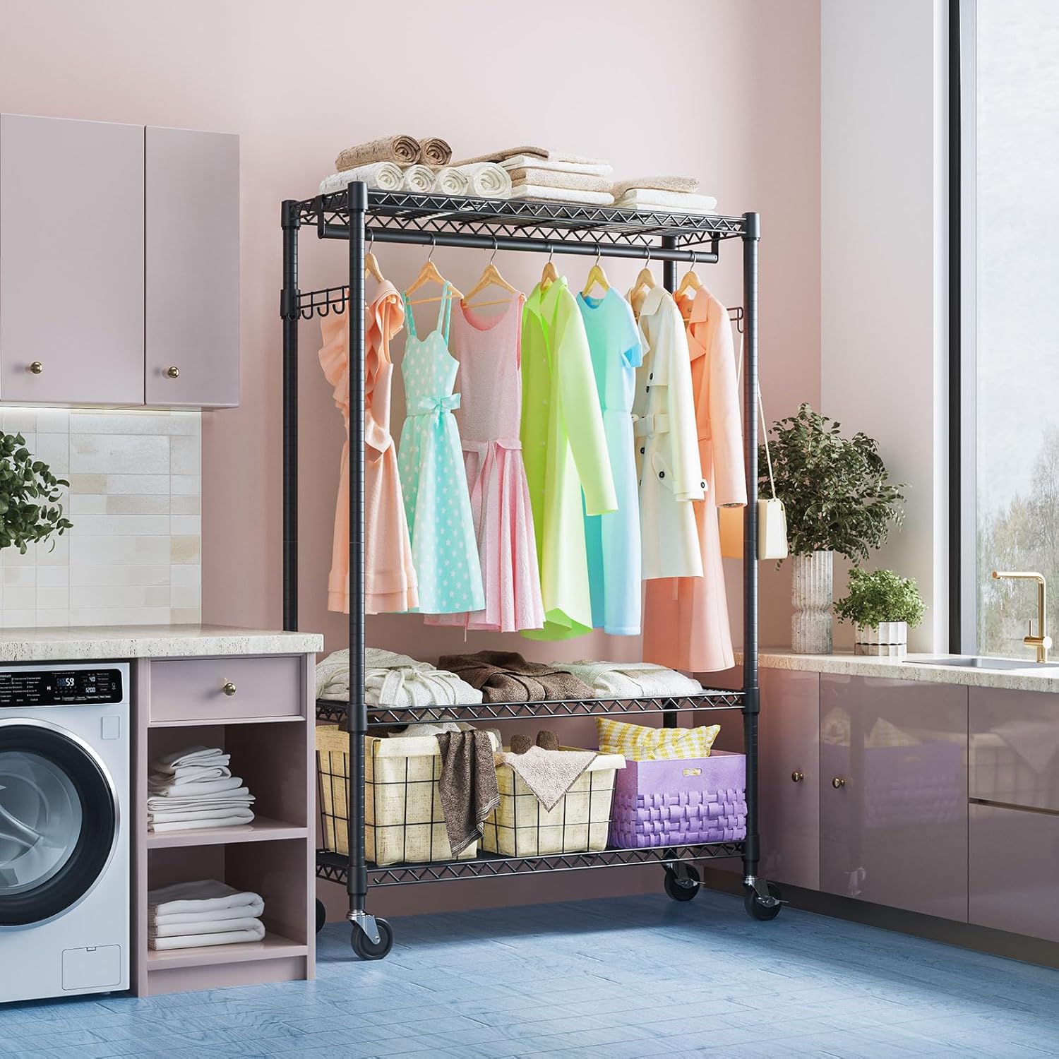 - Rotatable 360° Wheels And Versatile: This rolling clothes rack has 4 heavy-duty rolling wheels, and thus you can easily move anywhere you need, such as the showroom entry closet, bathroom, garage, laundry room, hallway, balcony, bedroom, cloakroom, and more. And 2 of them are lockable, which ensures more security