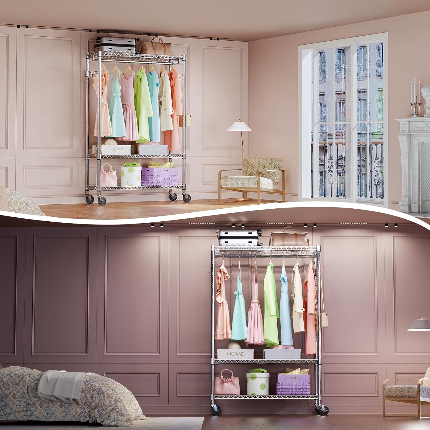 - Rotatable 360° Wheels & Versatile Use: This rolling clothes rack features 4 heavy-duty 360° swivel wheels for easy mobility across various spaces, including your laundry closet, showroom, entryway, bathroom, garage, hallway, bedroom, or cloakroom. Two wheels are lockable for added stability and security during use.