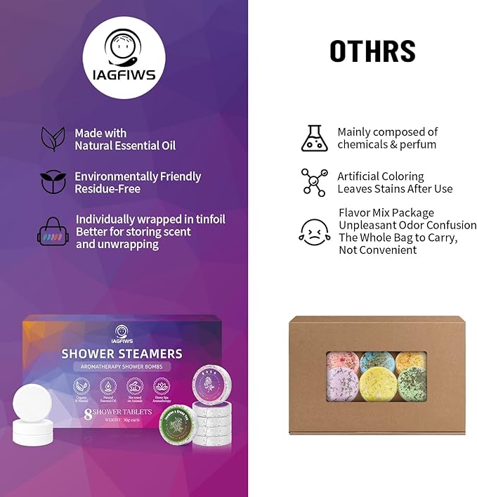 - CAN BE USEB IN DIFFERENT SCENARIOS: IAGFIWS shower steamers are versatile and can be used in different settings, including your car, bedroom, or even on your desk, providing an aromatherapy experience in various scenarios. While traveling, carry the bath set and enjoy a refreshing shower on the go, melting away stress and worries. After a tiring day at work, enjoy the captivating natural essential oil fragrance of the shower steamers, enough to relieve your fatigue.