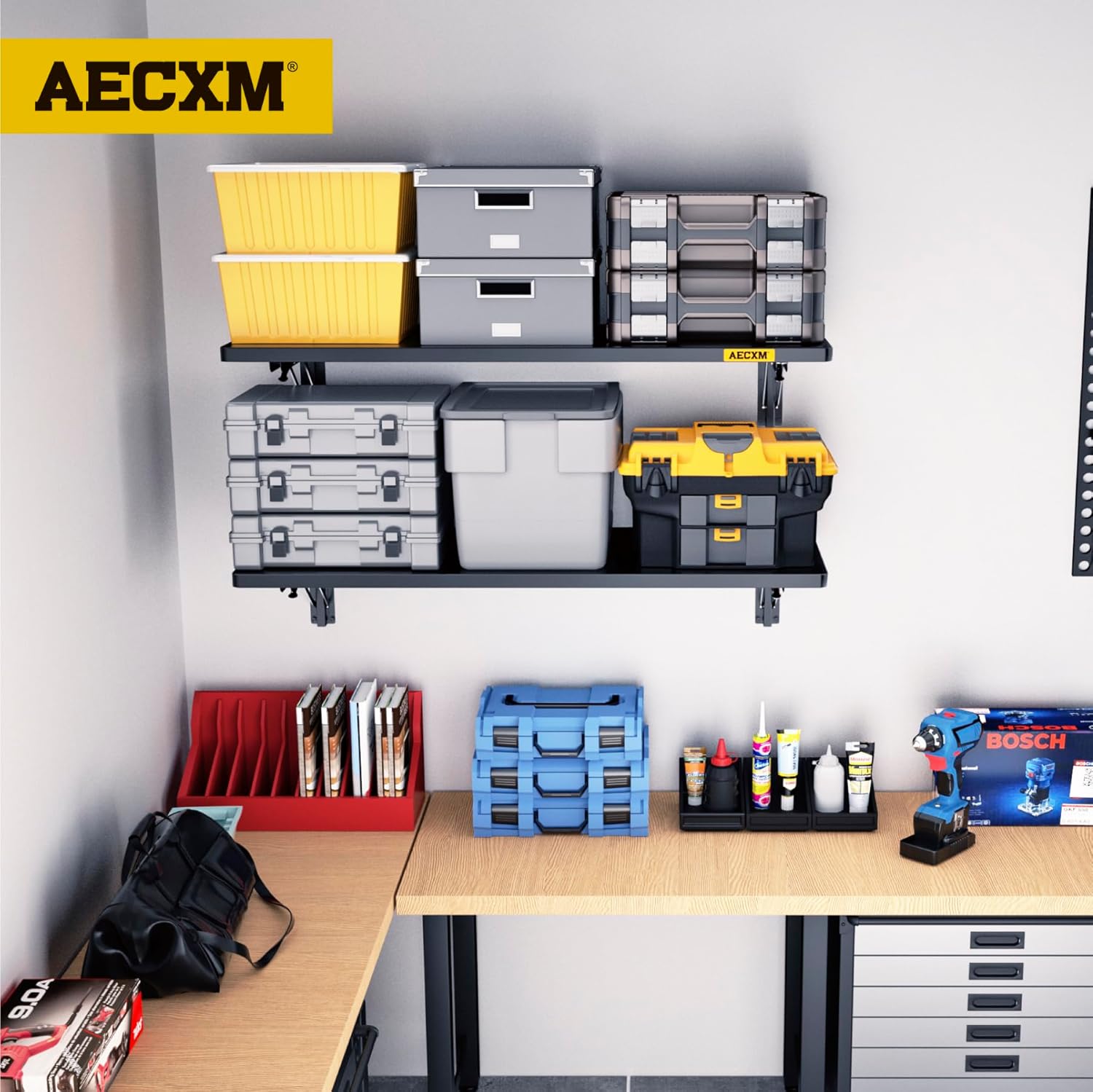 - SUPERIOR DESIGN: The foldable garage storage shelf panel is made of whole steel plate, The surface of matte high temperature powder baking paint, Flat and smooth, Panel with sliding rail design, The bracket can be installed freely in the range of 12"-45" spacing of wood wall keel, And at the same time it adopts folding bracket, Which can be freely stowed away or unfolded.