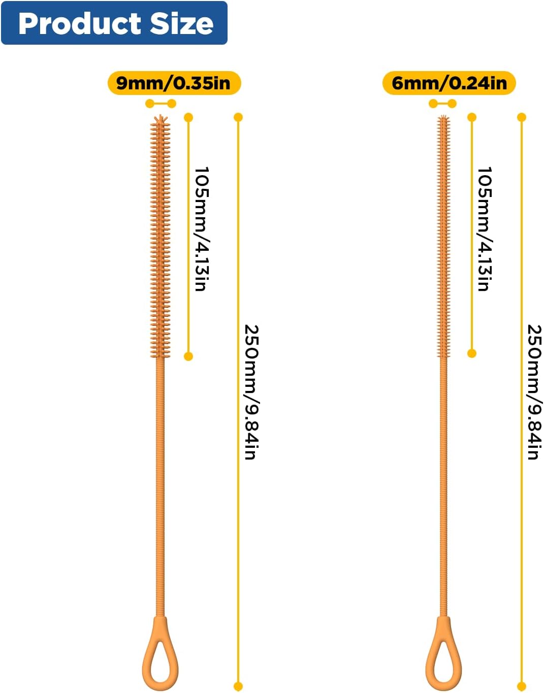 - >Multi Size: The set includes two diameters silicone straw brush, the length is 250mm, the diameters are 6mm and 9mm, and the brush head part is lengthened to 100mm, due to its extra long and soft design, it can easily brush the bottom of all kinds of straws, and it can clean every part of the straws to achieve a thorough cleaning effect.