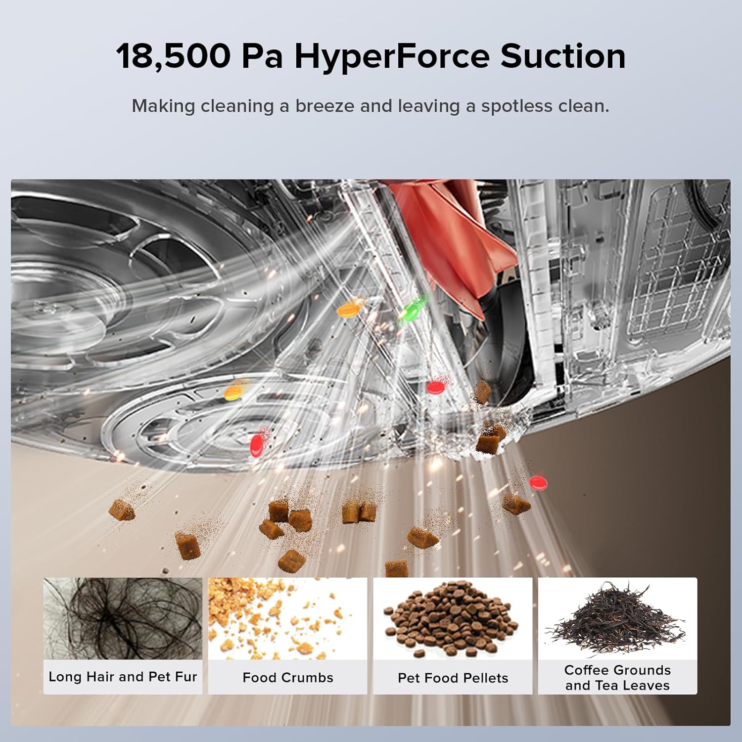 • Unmatched Cleaning Power: With up to 18,500 Pa strong suction, it easily overcomes all cleaning challenges, powerfully lifting hair, debris, dust, and dirt from carpets and hard floors into the dustbin.