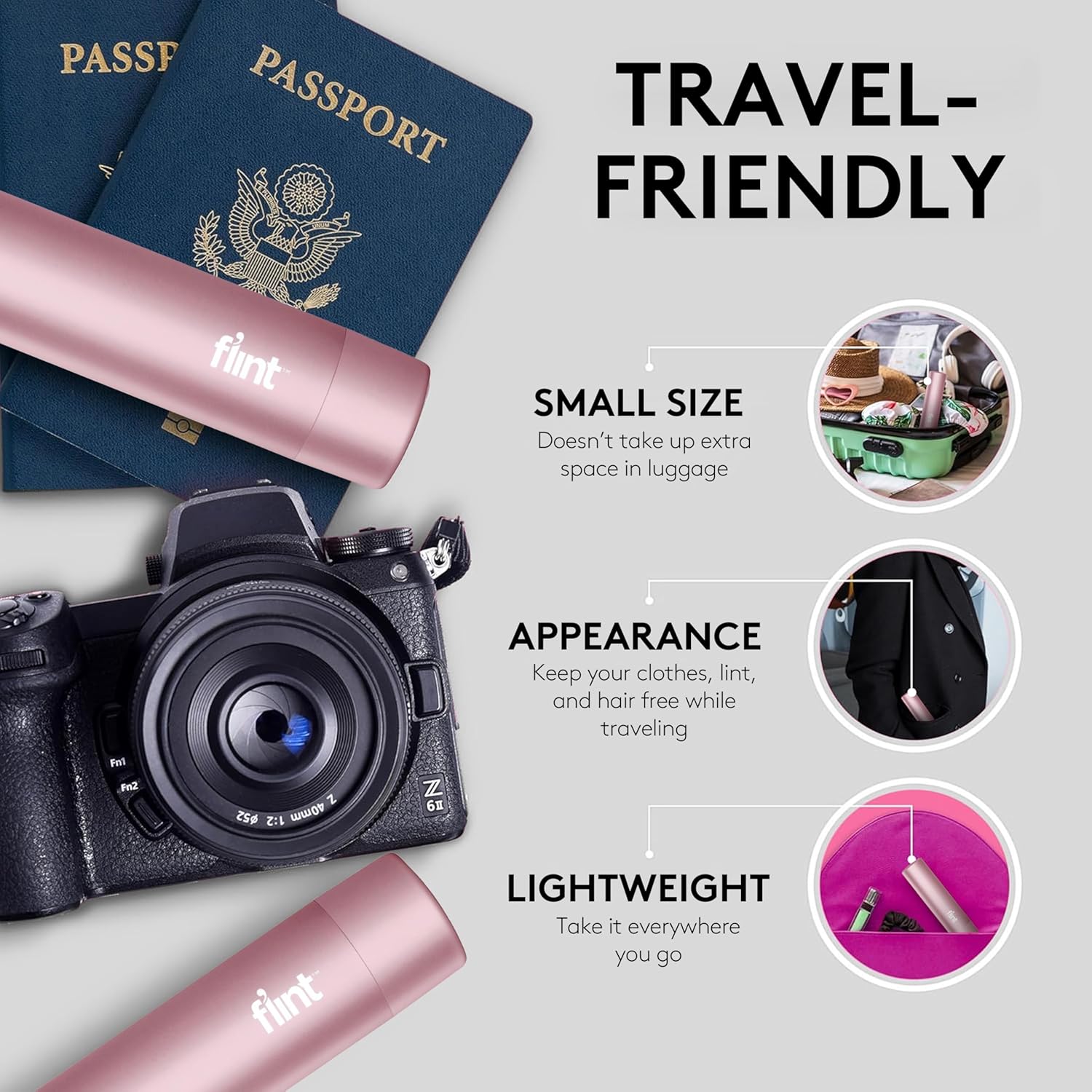Flint Rose Gold Retractable Mini Lint Roller with 90 Extra Sticky Sheets, Small and Portable Lint Roller, Ideal Pet Hair Remover, Travel Lint Rollers for pet Hair Extra Sticky