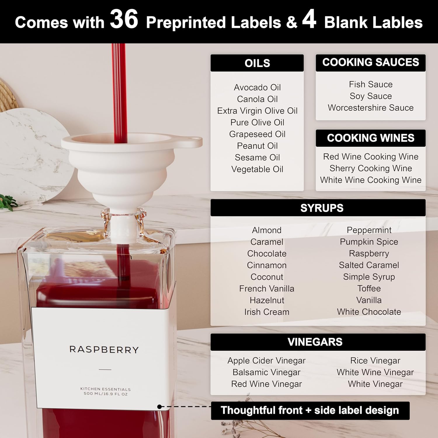 - Modern Kitchen Essential: Elegant and minimalist olive oil dispenser bottle include 4 high-quality 16.9 oz (500 ml) glass bottles, 4 weighted self-closing spouts, 4 Silicone Dust-Proof Oil Spouts, 1 funnel and a set of 40 labels, making them a must-have for any kitchen. Practical and decorative for your kitchen counter, these cooking oil dispenser meet all your kitchen needs for style and functionality!