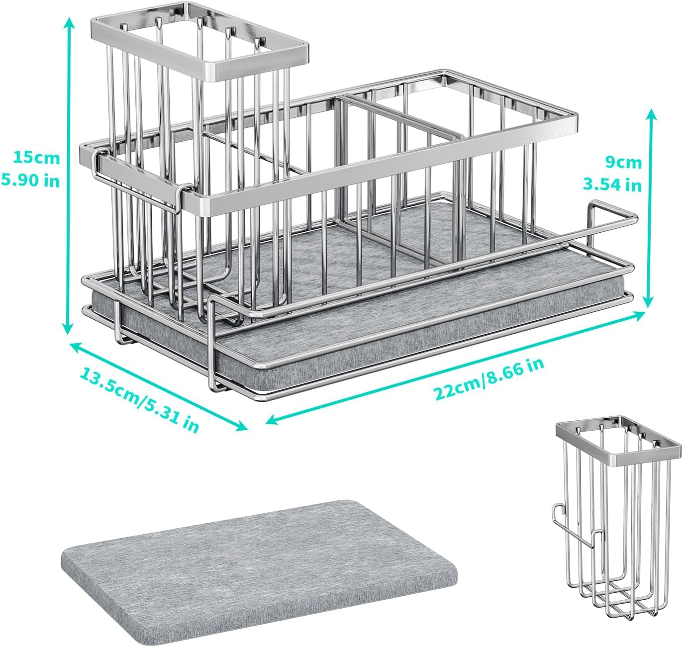 - [Anti-slip Kitchen Caddy]: We know many customers will worry about instability of kitchen sponge holder. Therefore, our kitchen sink accessories added non-slip rubber feet. No need to worry about sliding and stability of this sponge caddy