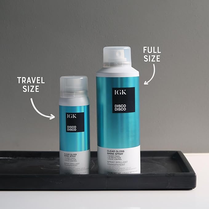 - TSA Approved: IGK Disco Disco travel-sized clear gloss shine hair spray.