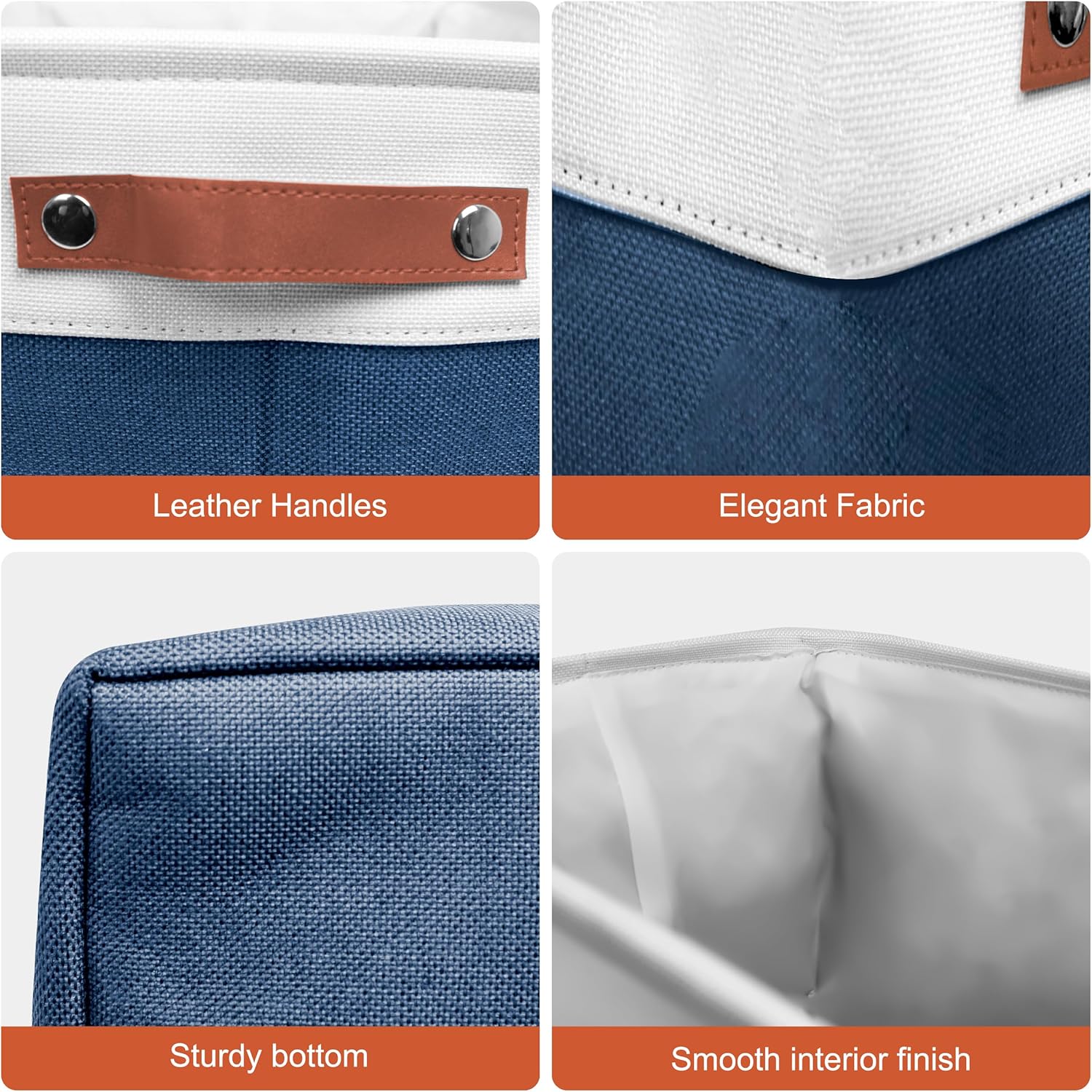13in Open Fabric Storage Basket with Leather Handles for Organizing, Collapsible Linen Closet Bins for Shelves, Closets, Laundry, Decorative Basket for Gifts. (White&Blue, 3PCS/13x13in)