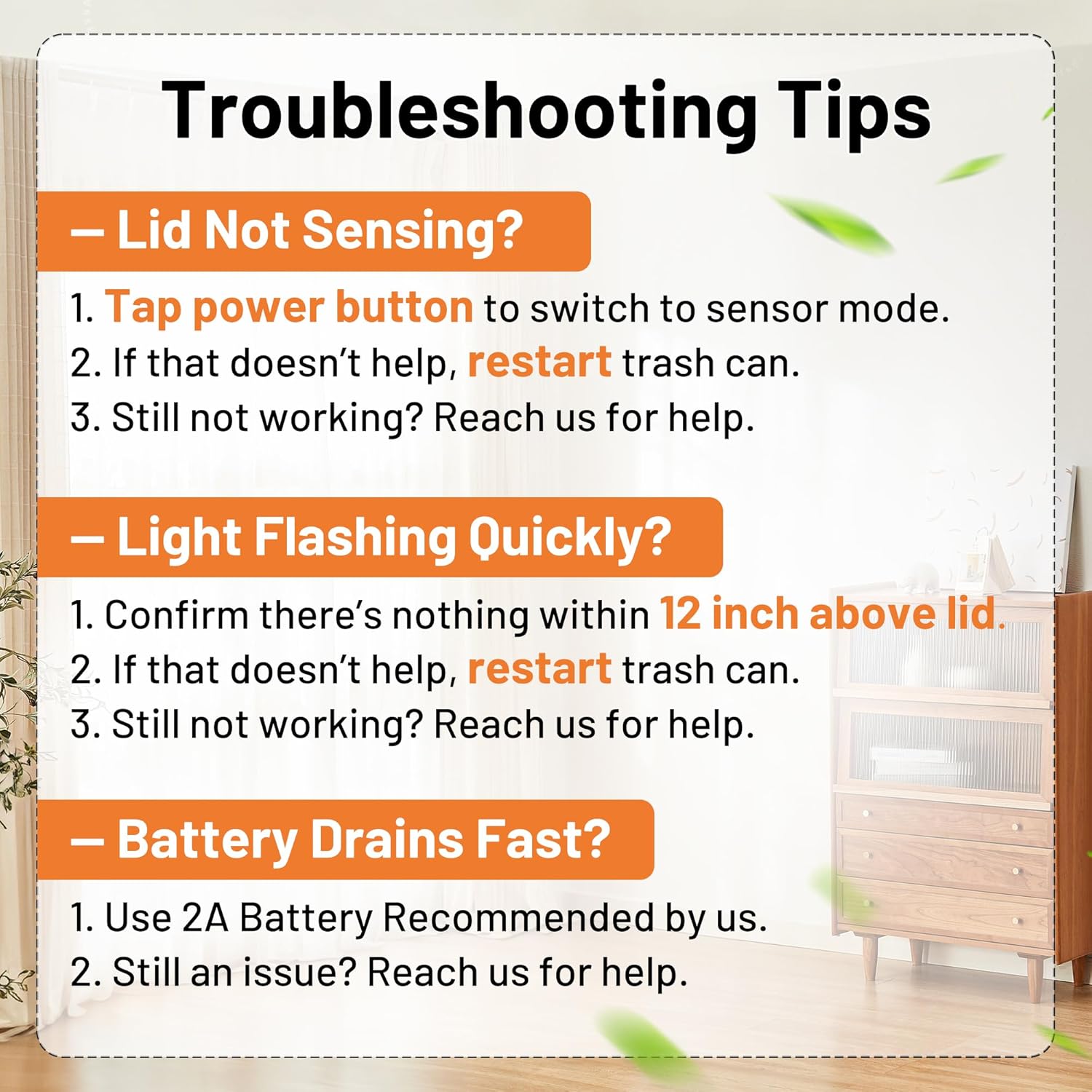 - 【CUSTOMER NOTICE】 The bathroom wastebasket requires two AA batteries (not included). Press and hold the switch to turn the power on/off. If the light flashes and the sensor does not work, you can try to turn off the power and restart the smart trash can.