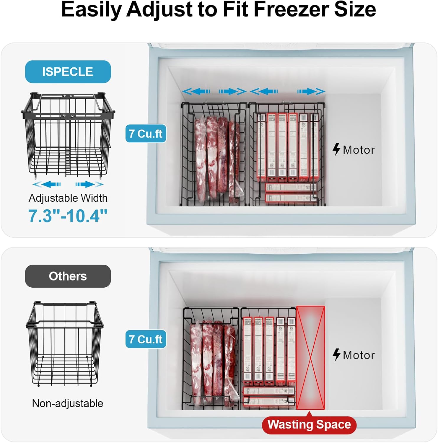 - [Customizable Fit for 5/7/9 cu ft Freezer]: iSPECLE freezer organizer bins measure 14.8" L x 7.1" to 10.63" W x 8.46" H; Adjust the width to fit chest freezers perfectly; Holds 3 bins for 5 cu ft and 6 bins for 7/9 cu ft freezer, maximize freezer space efficiency