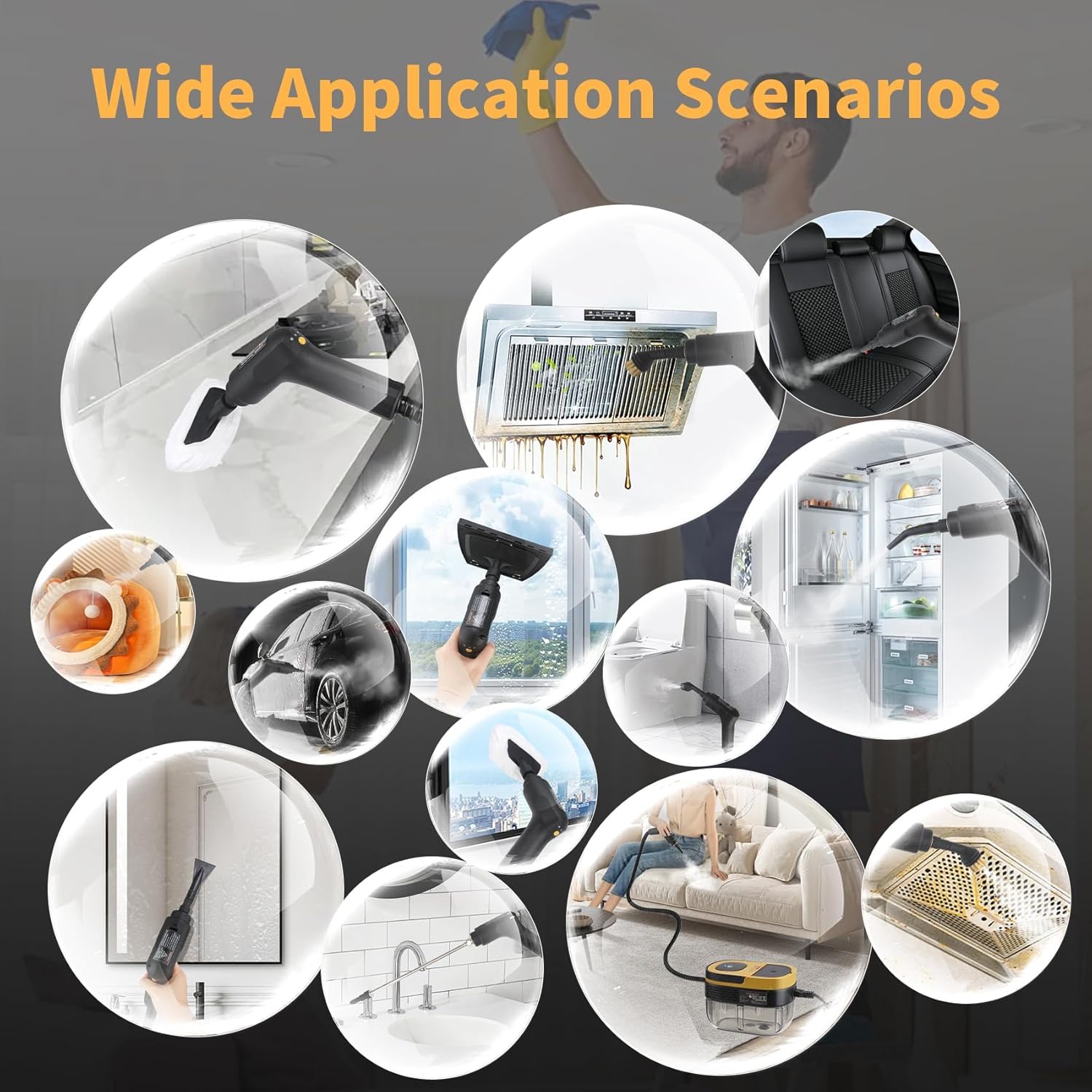 - 【Widely used】Widely used in kitchen, bathroom, and living room, such as cleaning range hood, stove, refrigerator, bathtub, interior decoration, grouting, tiles, windows, sofa, flooring, carpets, washing machine, refrigerator, mud, and tiles.(It is not recommended to use a high-temperature steam machine on cold glass.)