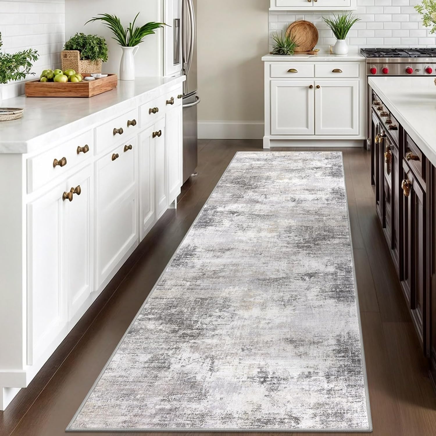 IOHOUZE Abstract Runner Rug 3x10 Ft Washable Runners for Hallways, Non Slip Kitchen Runner Printed Faux Wool Entryway Runner Indoor, Modern Abstract Floor Carpet for Hall Bedroom, Grey Beige